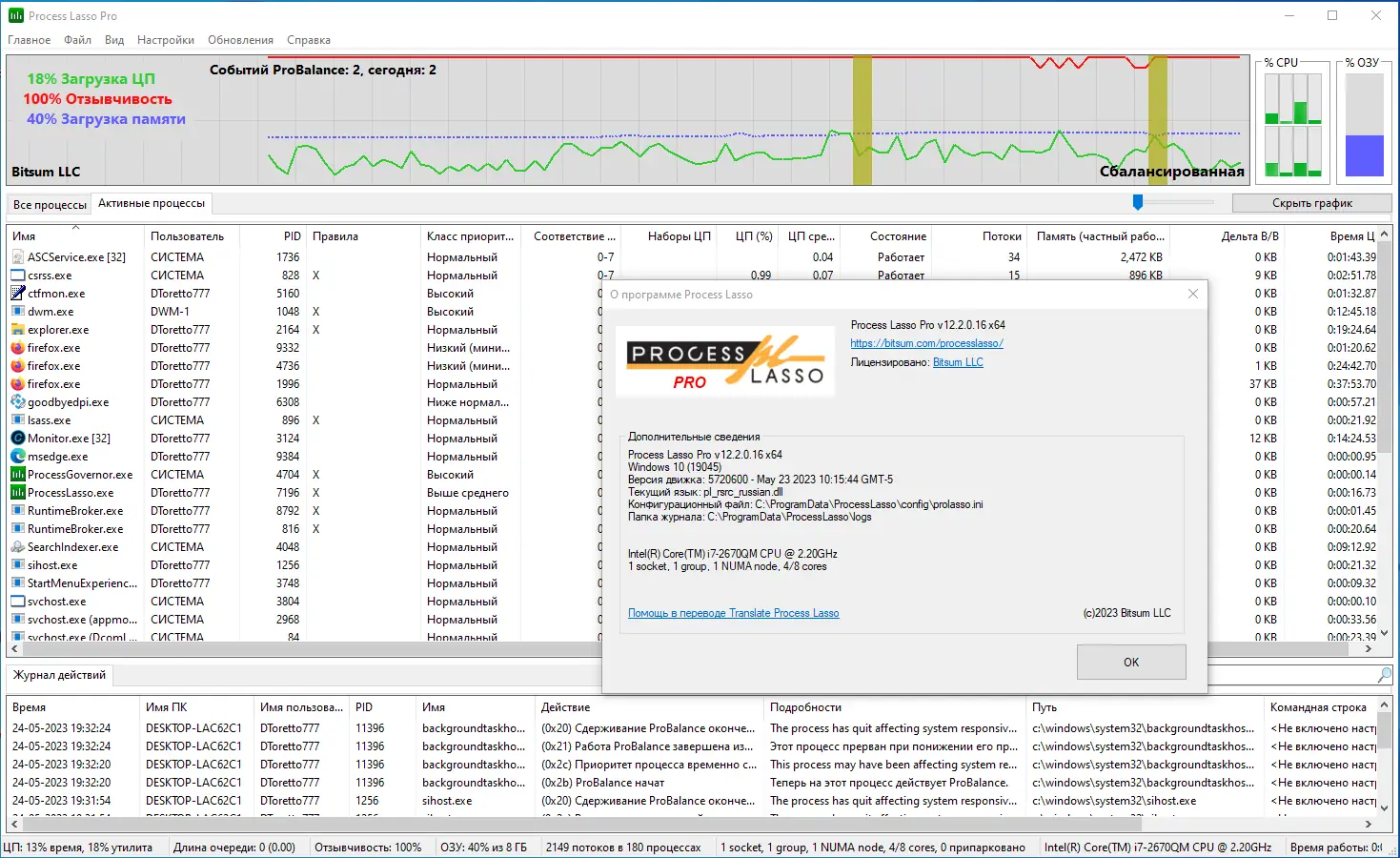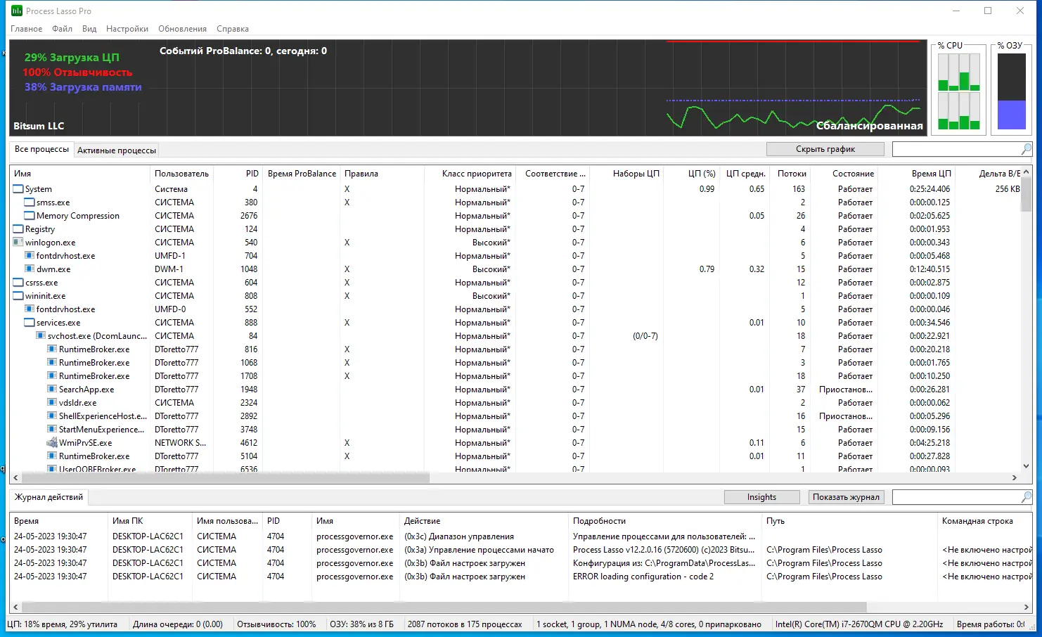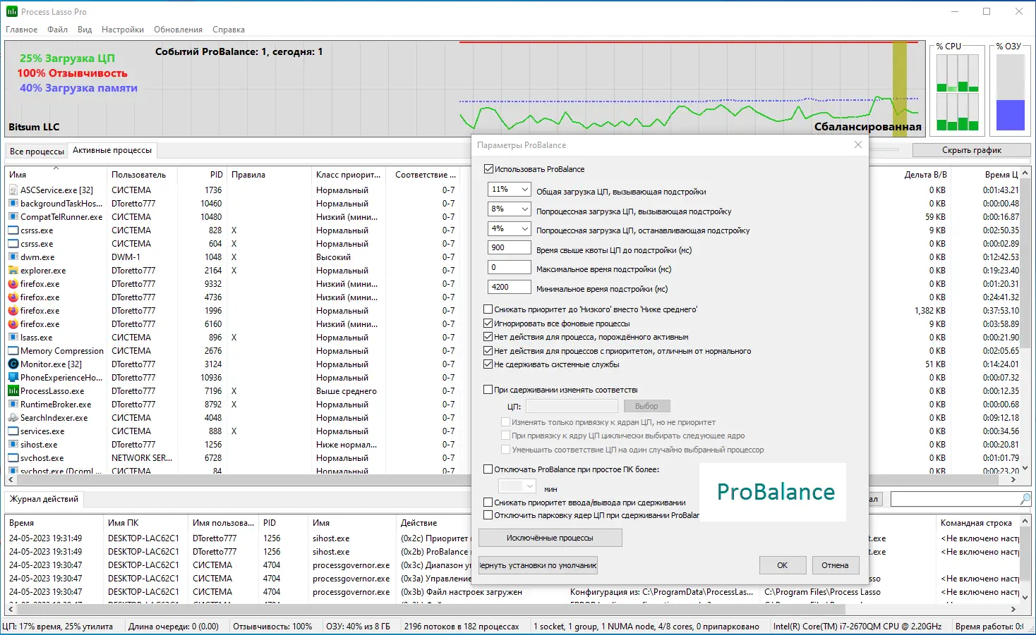 Process Lasso представляет собой инструмент системной оптимизации, предназначенный для управления активными процессами в реальном времени. Утилита анализирует поведение программ, определяя те, которые чрезмерно используют ресурсы центрального процессора, и корректирует их приоритеты, чтобы избежать тормозов и зависаний. В основе технологии лежит алгоритм ProBalance, который динамически перераспределяет нагрузку, сохраняя отзывчивость системы даже при запуске ресурсоёмких приложений. Это особенно полезно на многозадачных системах, где одновременно работают десятки процессов, конкурирующих за ресурсы. Программа не убивает процессы, а мягко регулирует их активность, что исключает потерю данных и нестабильность.