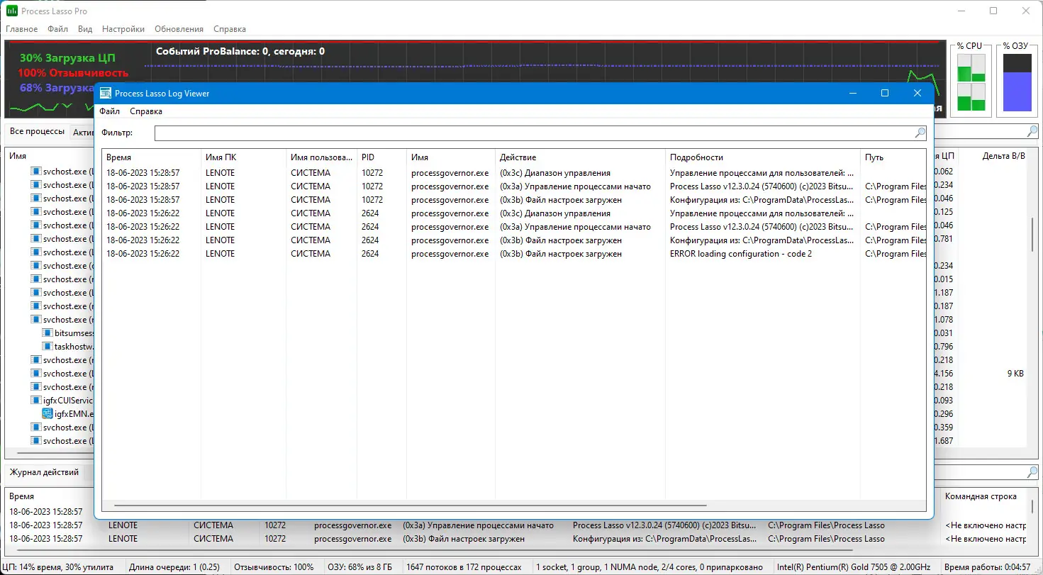 Интерфейс Process Lasso интуитивно понятен и не требует углублённых знаний в области системного администрирования. После запуска утилита начинает анализировать процессы, отображая их в виде списка с детальной информацией о загрузке ЦП, памяти и приоритетах. Пользователь может вручную изменить приоритет, используя контекстное меню, или задать правила, по которым определённые процессы будут автоматически понижаться в приоритете при превышении порога нагрузки.