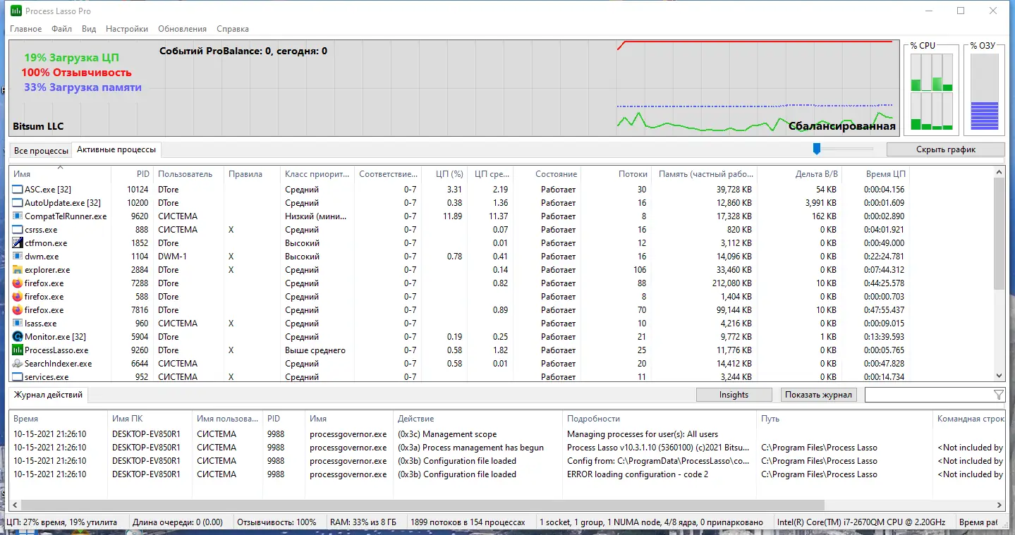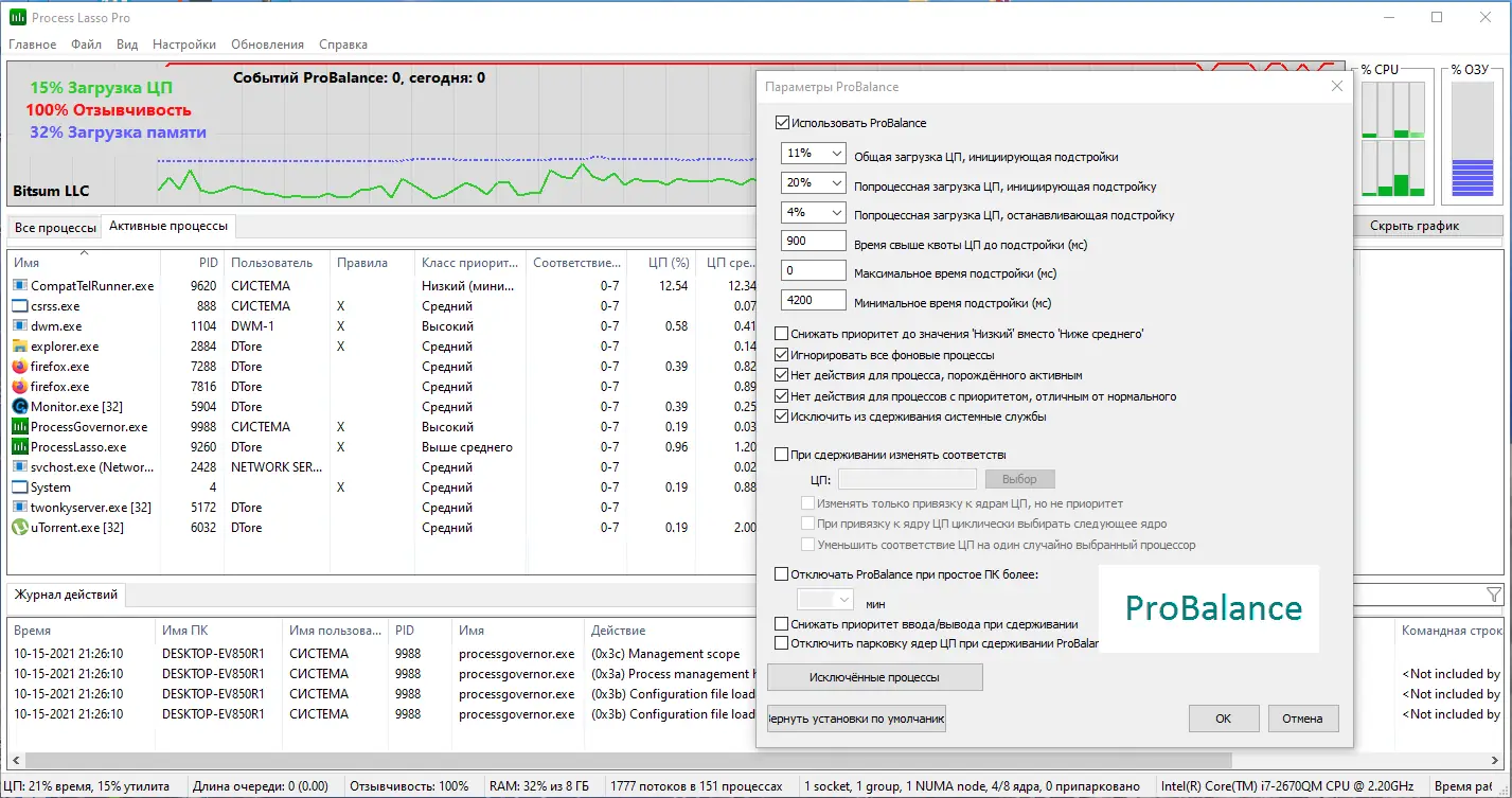 - Функция ProBalance, снижающая нагрузку от агрессивных процессов без их завершения