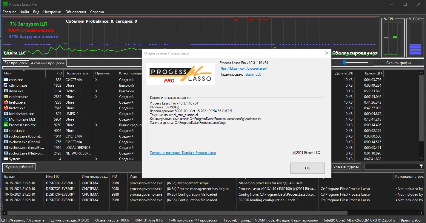 Process Lasso — это системная утилита, предназначенная для повышения отзывчивости и стабильности операционной системы за счёт интеллектуального управления приоритетами запущенных процессов. Программа автоматически оптимизирует нагрузку на центральный процессор, предотвращая зависания и лаги, вызванные перегрузкой ресурсов.