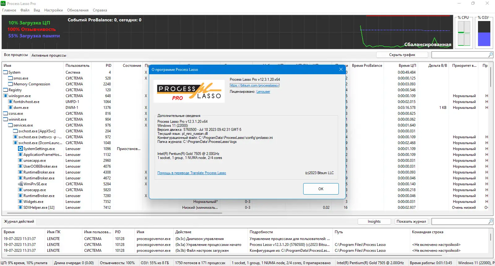 Process Lasso — это программное обеспечение для тонкой настройки приоритетов запущенных процессов в системе, направленное на повышение отзывчивости и общей производительности. Инструмент работает как в автоматическом, так и в ручном режиме, позволяя эффективно управлять нагрузкой на центральный процессор. Благодаря технологии ProBalance, система остаётся стабильной даже при высокой нагрузке от отдельных приложений.