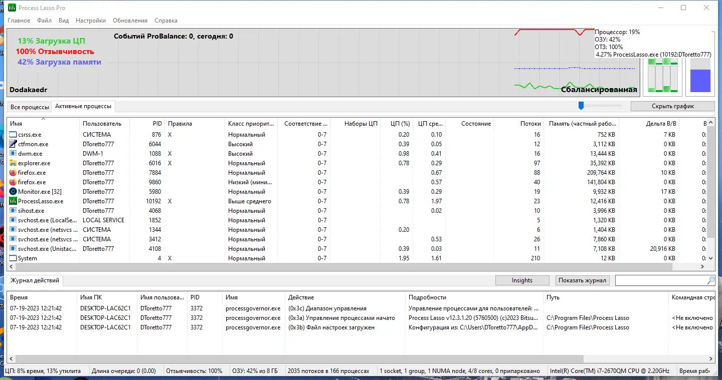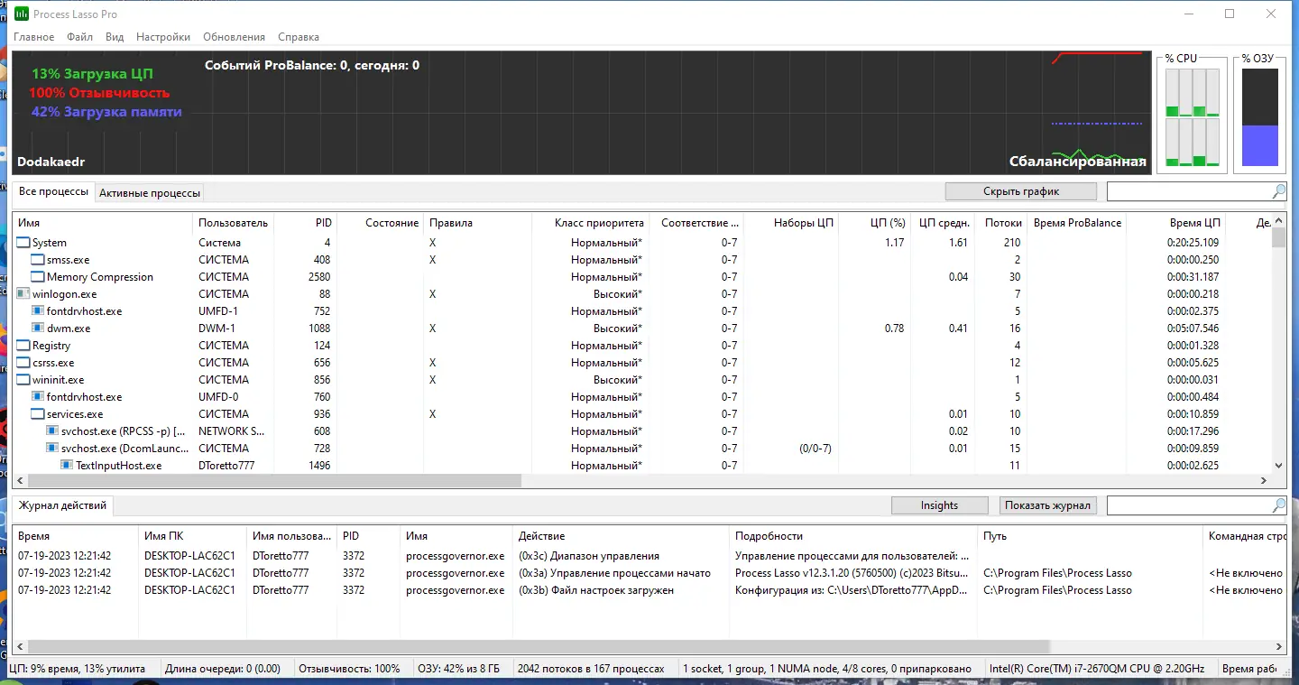 Интерфейс Process Lasso интуитивно понятен и не требует глубоких технических знаний. После запуска программа начинает мониторинг всех процессов, отображая их в виде списка с информацией о загрузке ЦП, приоритете и родственности к ядрам. Через контекстное меню, вызываемое правой кнопкой мыши, можно быстро установить нужный приоритет, задать привязку к определённому ядру процессора или создать правило для будущих сессий. Всплывающие уведомления информируют о внесённых изменениях, а система подсчёта реактивности даёт объективную оценку производительности системы в текущий момент.