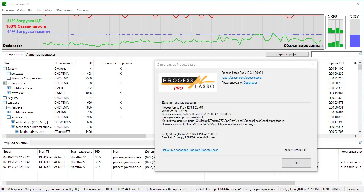 Process Lasso — это инструмент для управления процессами в операционной системе Windows, направленный на повышение отзывчивости и стабильности компьютера. Программа автоматически регулирует приоритеты запущенных приложений, предотвращая чрезмерное использование ресурсов процессора. Благодаря технологии ProBalance система остаётся быстрой даже при высокой нагрузке.