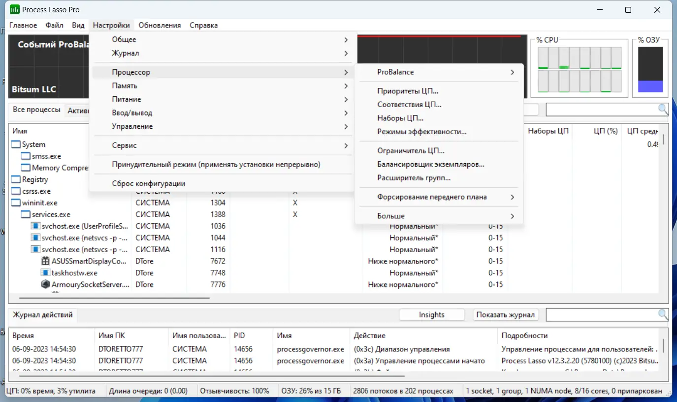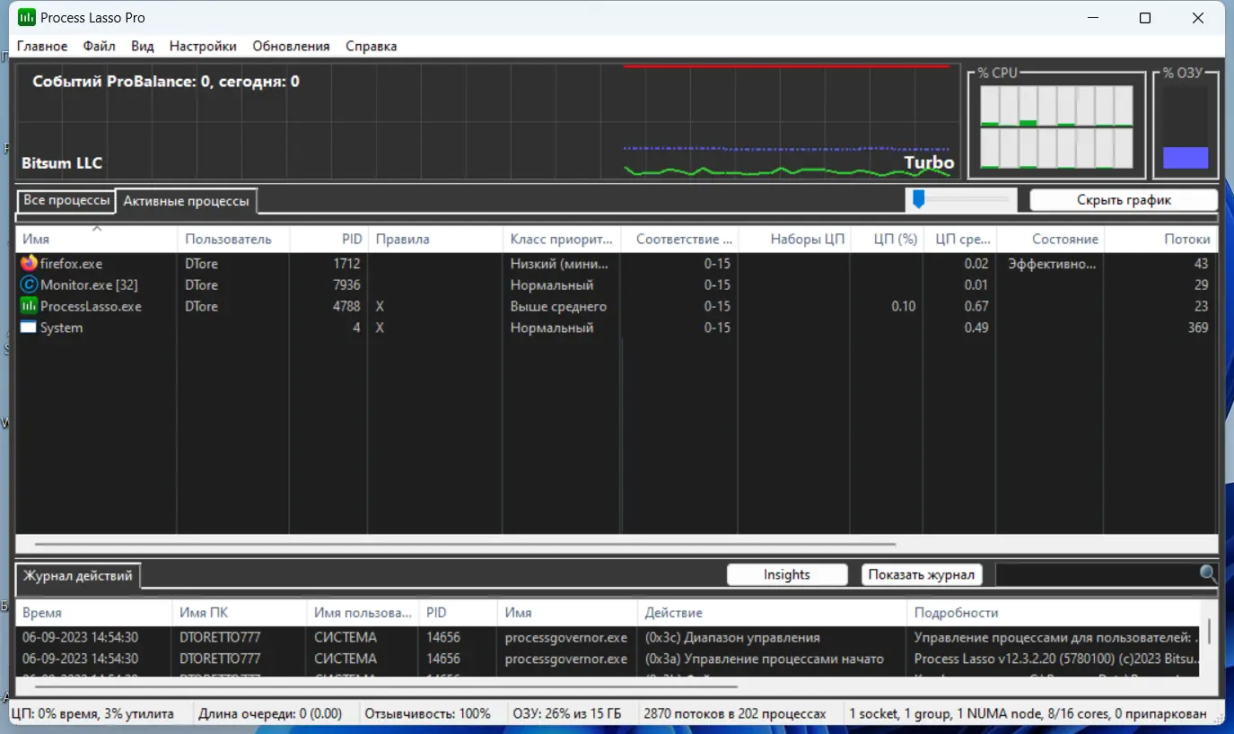 Process Lasso — это инструмент для управления процессами в системе, обеспечивающий стабильность и отзывчивость Windows при высокой нагрузке на процессор. Программа автоматически регулирует приоритеты запущенных приложений, предотвращая подвисания и лаги. Благодаря технологии ProBalance, система остаётся живой даже при интенсивной работе ресурсоёмких задач.