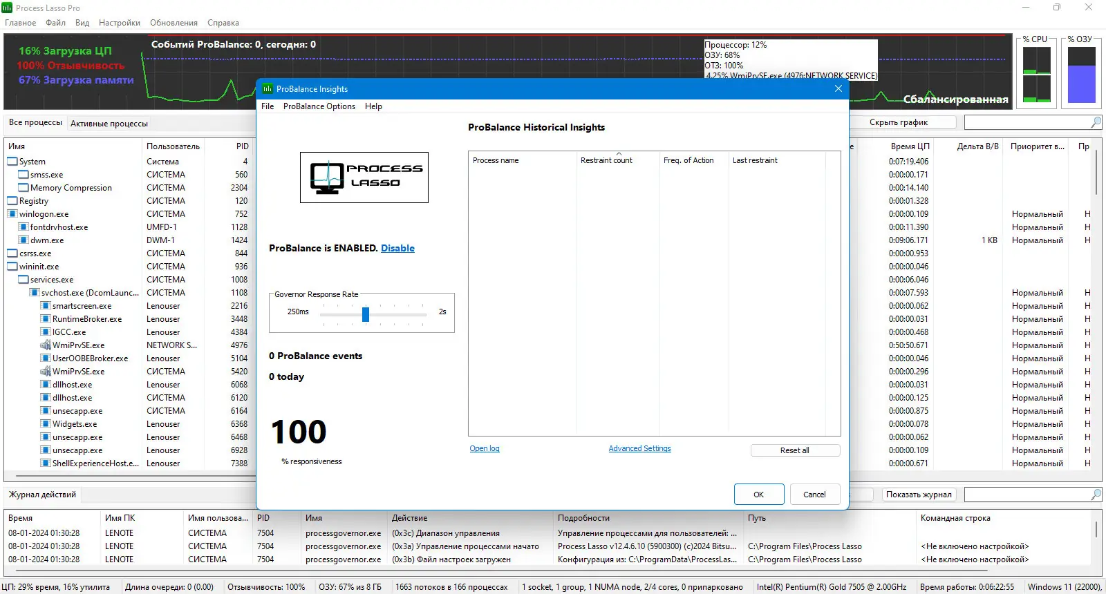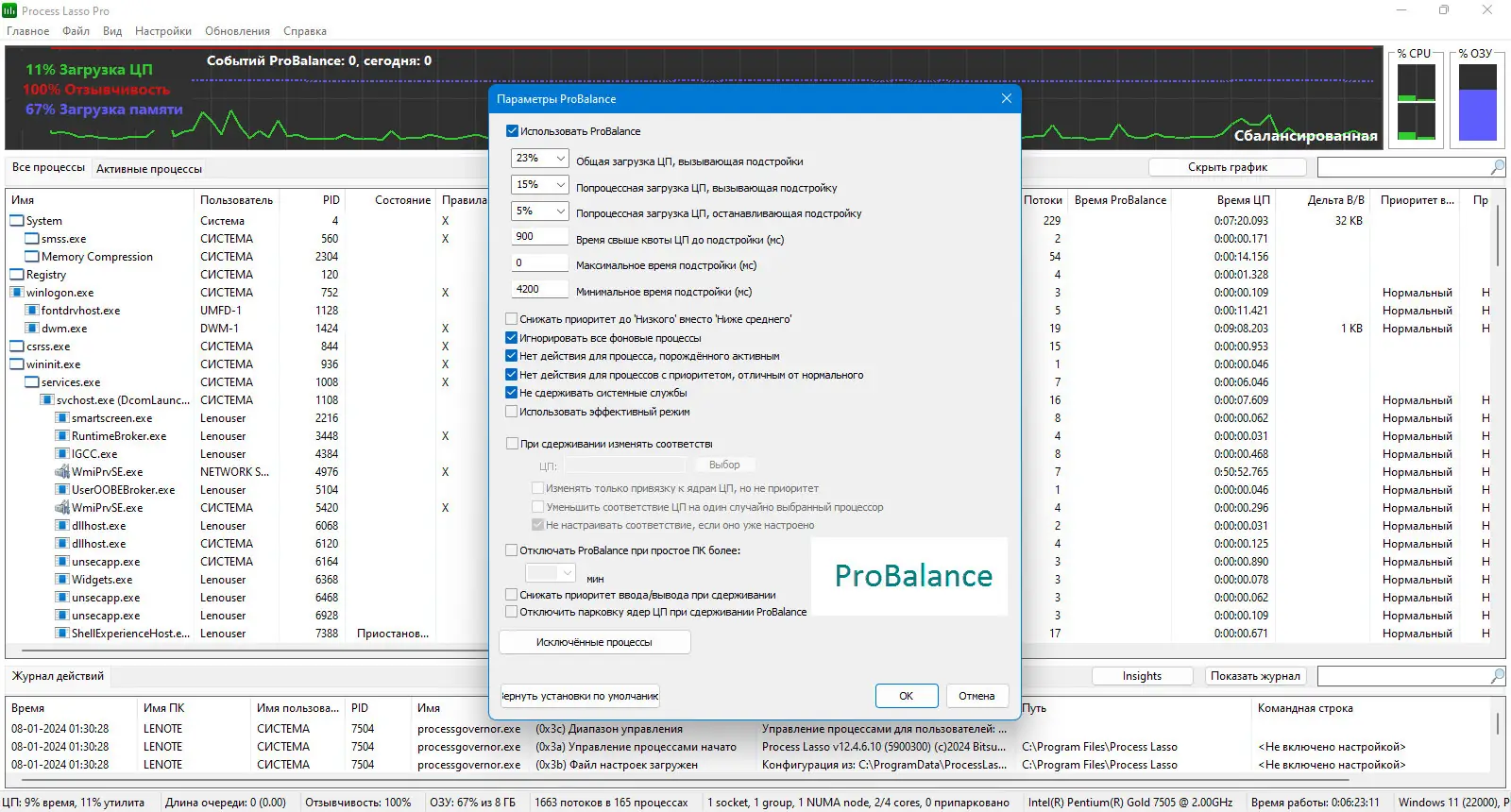 Технология ProBalance автоматически снижает приоритет «ожирающих» процессов, не прерывая их выполнение.
