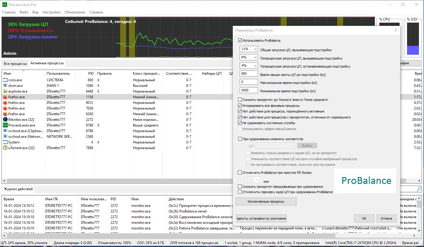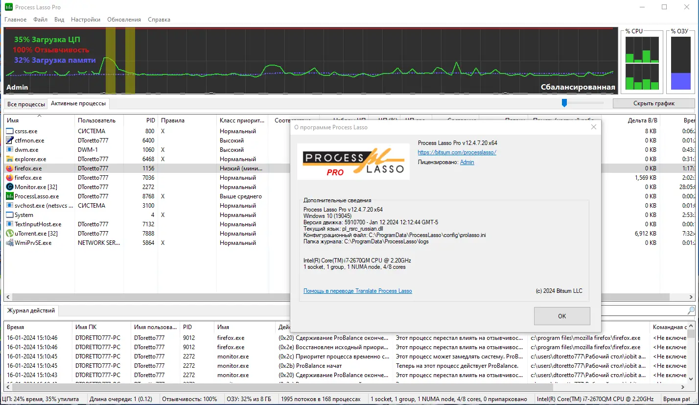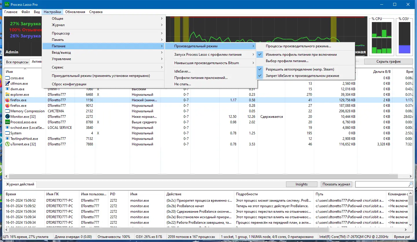 Process Lasso — это мощная системная утилита, предназначенная для управления процессами в операционной системе Windows. Программа автоматически оптимизирует приоритеты запущенных приложений, предотвращая перегрузку процессора и повышая отзывчивость системы. Благодаря технологии ProBalance, она обеспечивает стабильную работу даже при высокой нагрузке без необходимости вмешательства пользователя.