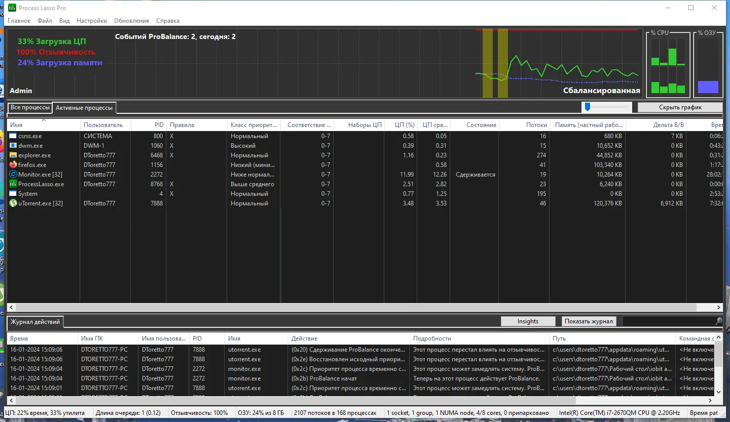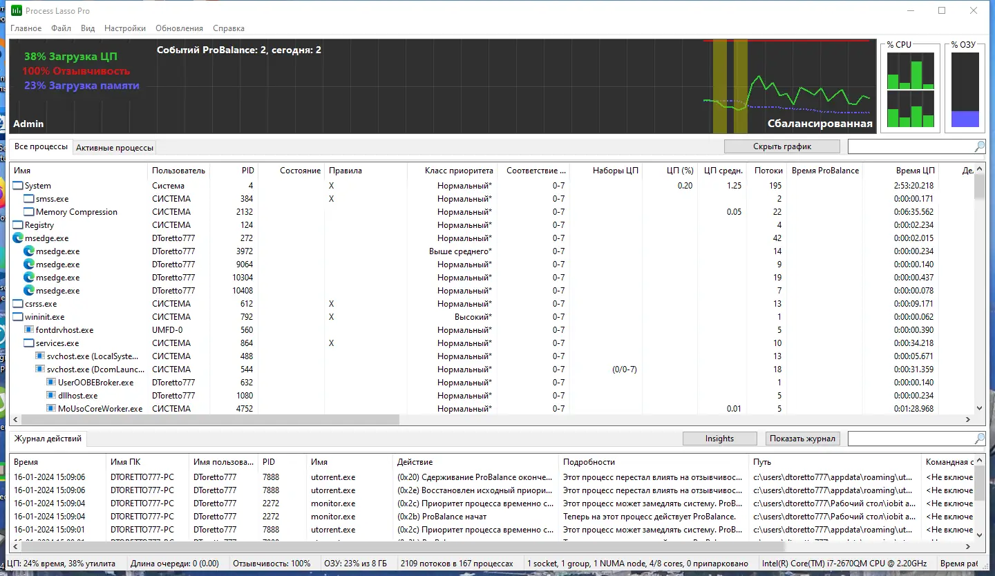 Process Lasso помогает поддерживать высокую производительность компьютера за счёт интеллектуального распределения ресурсов процессора. В отличие от стандартного поведения Windows, при котором отдельные процессы могут полностью блокировать центральный процессор, эта утилита динамически корректирует их приоритеты. Это предотвращает подвисания системы и делает работу с несколькими приложениями более комфортной. Программа поддерживает как ручное, так и автоматическое управление процессами, что делает её полезной как для новичков, так и для опытных пользователей.