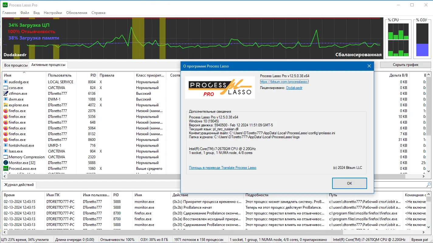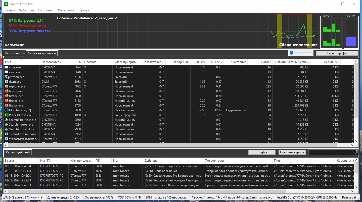 Process Lasso — это системная утилита, предназначенная для управления процессами в операционной системе Windows, обеспечивающая стабильность и высокую отзывчивость компьютера за счёт автоматической корректировки приоритетов задач. Программа эффективно предотвращает перегрузку процессора, минимизируя зависания и торможение системы при активной нагрузке.