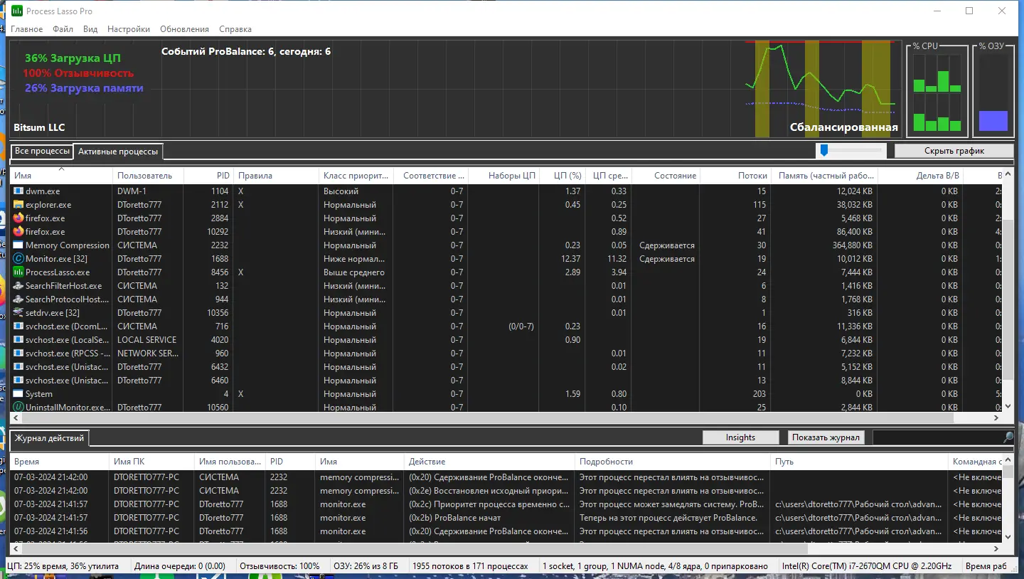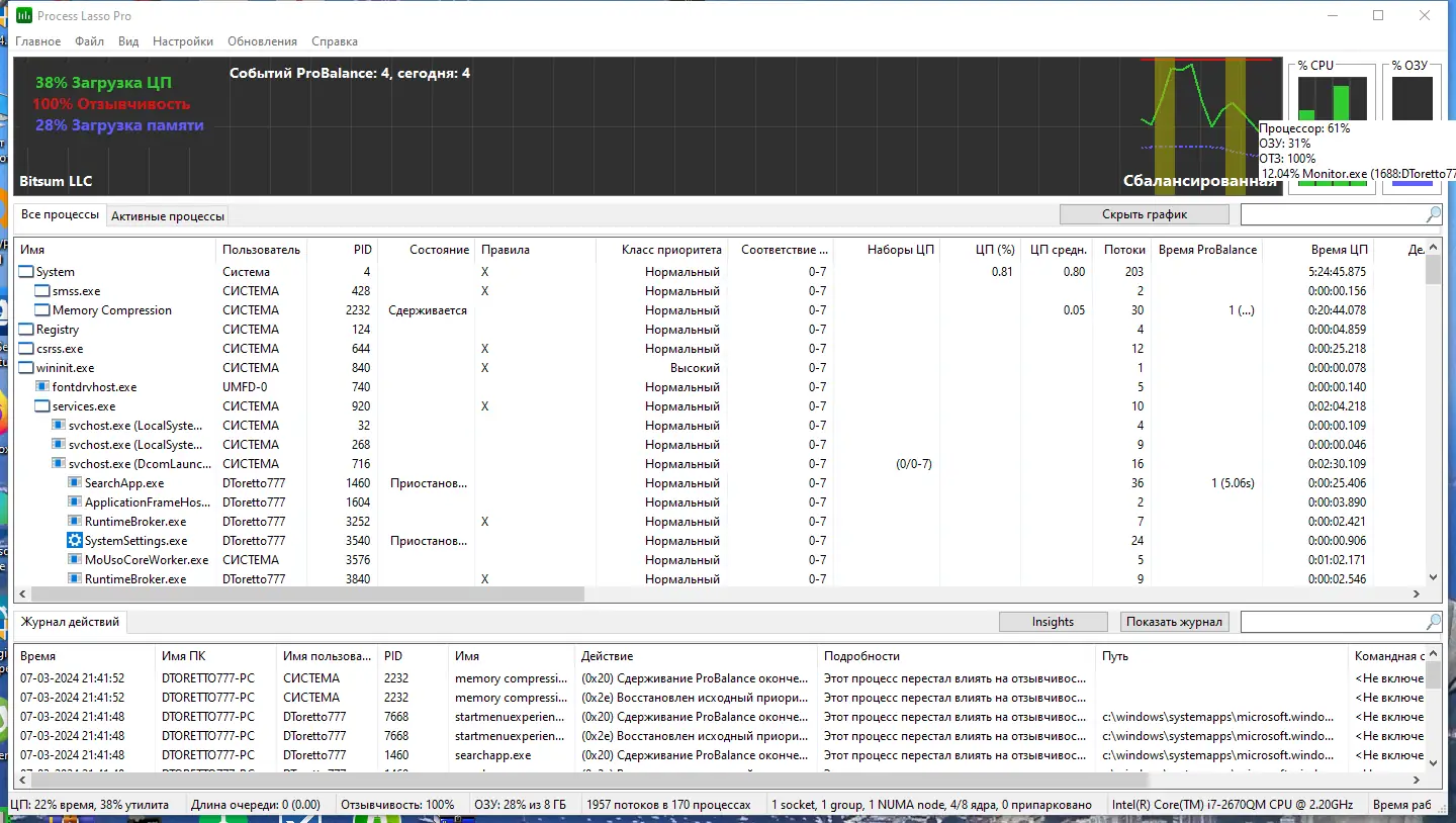 Process Lasso — это системная утилита, предназначенная для управления процессами в операционной системе Windows, с целью повышения отзывчивости и стабильности компьютера. Программа автоматически регулирует приоритеты запущенных задач, предотвращая перегрузку центрального процессора и обеспечивая плавную работу системы даже при высокой нагрузке.