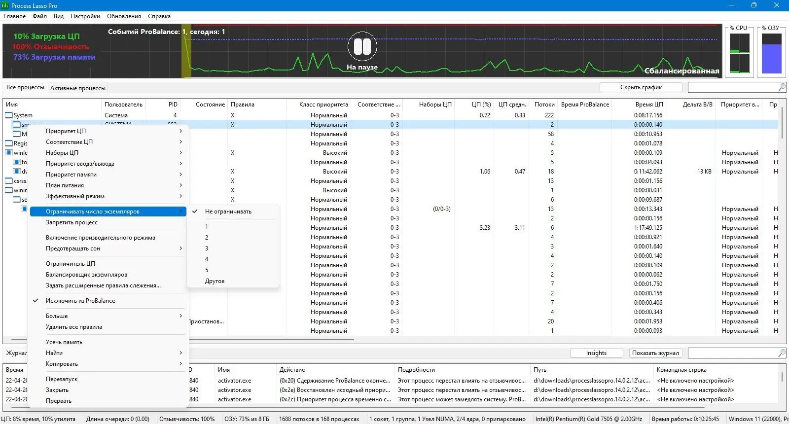 Process Lasso эффективно справляется с задачей поддержания отзывчивости системы в условиях интенсивной нагрузки. Утилита отслеживает поведение процессов, которые начинают чрезмерно потреблять ресурсы ЦП, и корректирует их приоритеты без вмешательства пользователя. Это особенно полезно при одновременном запуске нескольких приложений, когда одна из программ может случайно заблокировать доступ к вычислительным ресурсам.