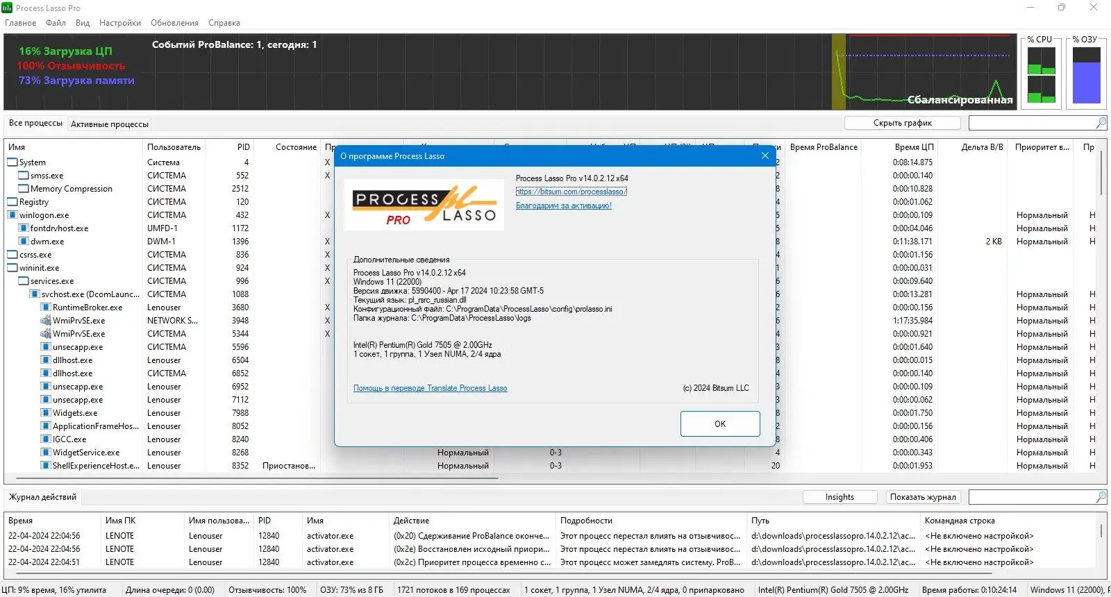Process Lasso — системная утилита, предназначенная для оптимизации производительности операционной системы за счёт управления приоритетами запущенных процессов. Программа автоматически регулирует нагрузку на центральный процессор, предотвращая зависания и торможение системы. Благодаря технологии ProBalance, она обеспечивает стабильную работу даже при высокой загрузке ресурсов.