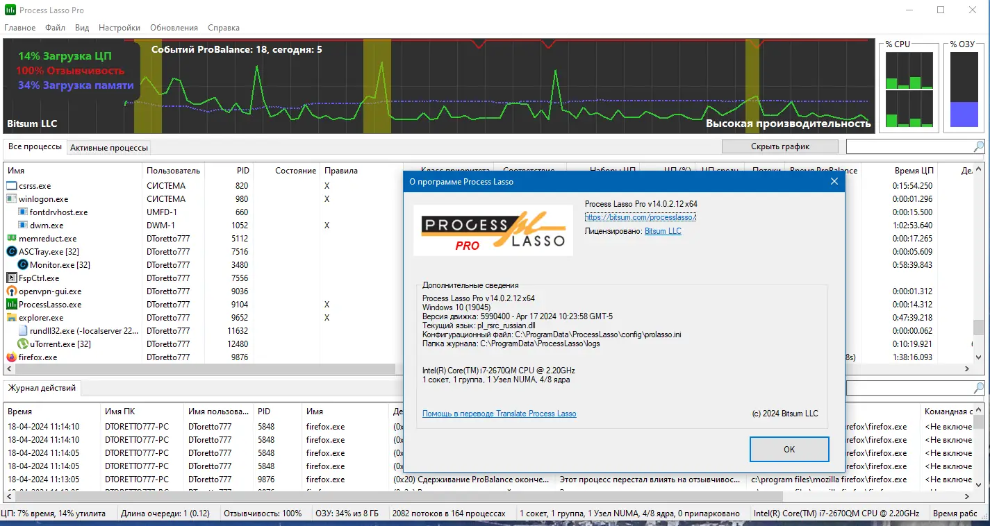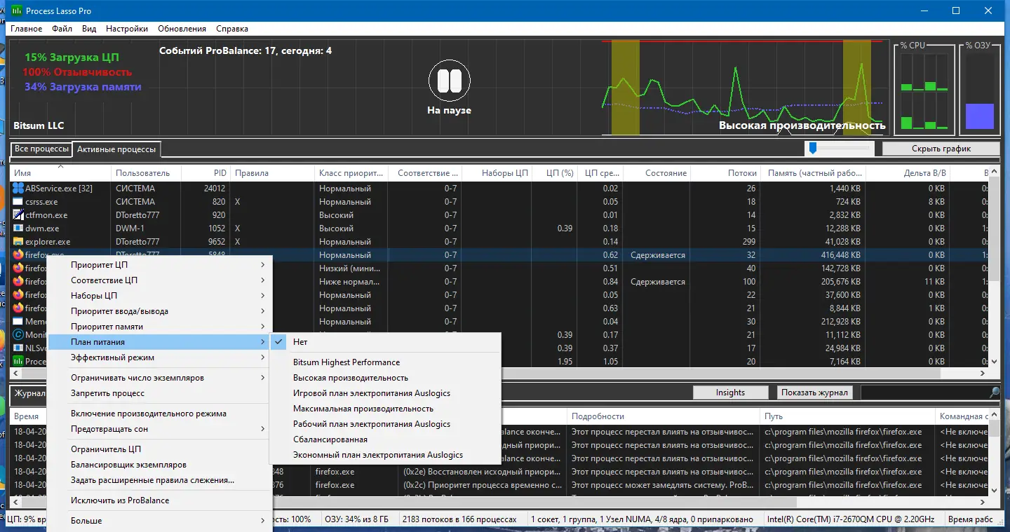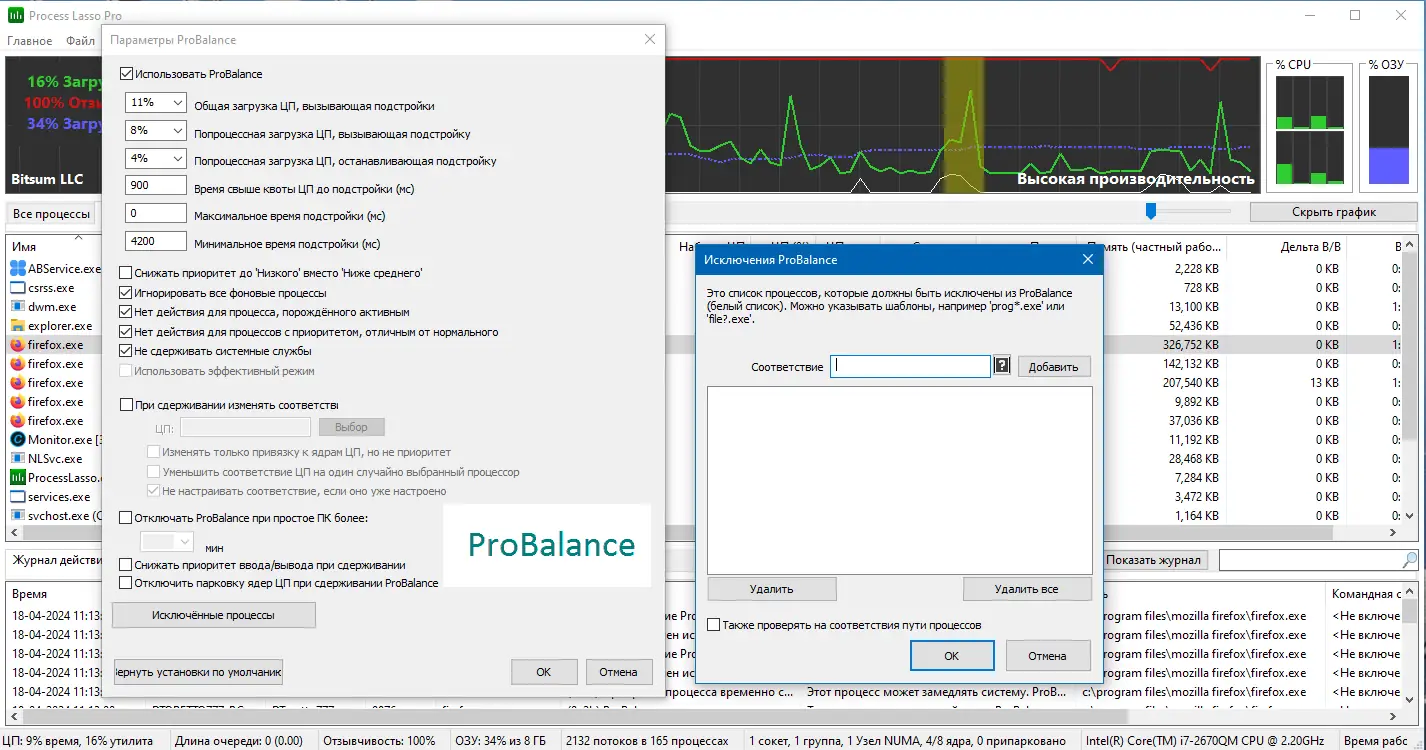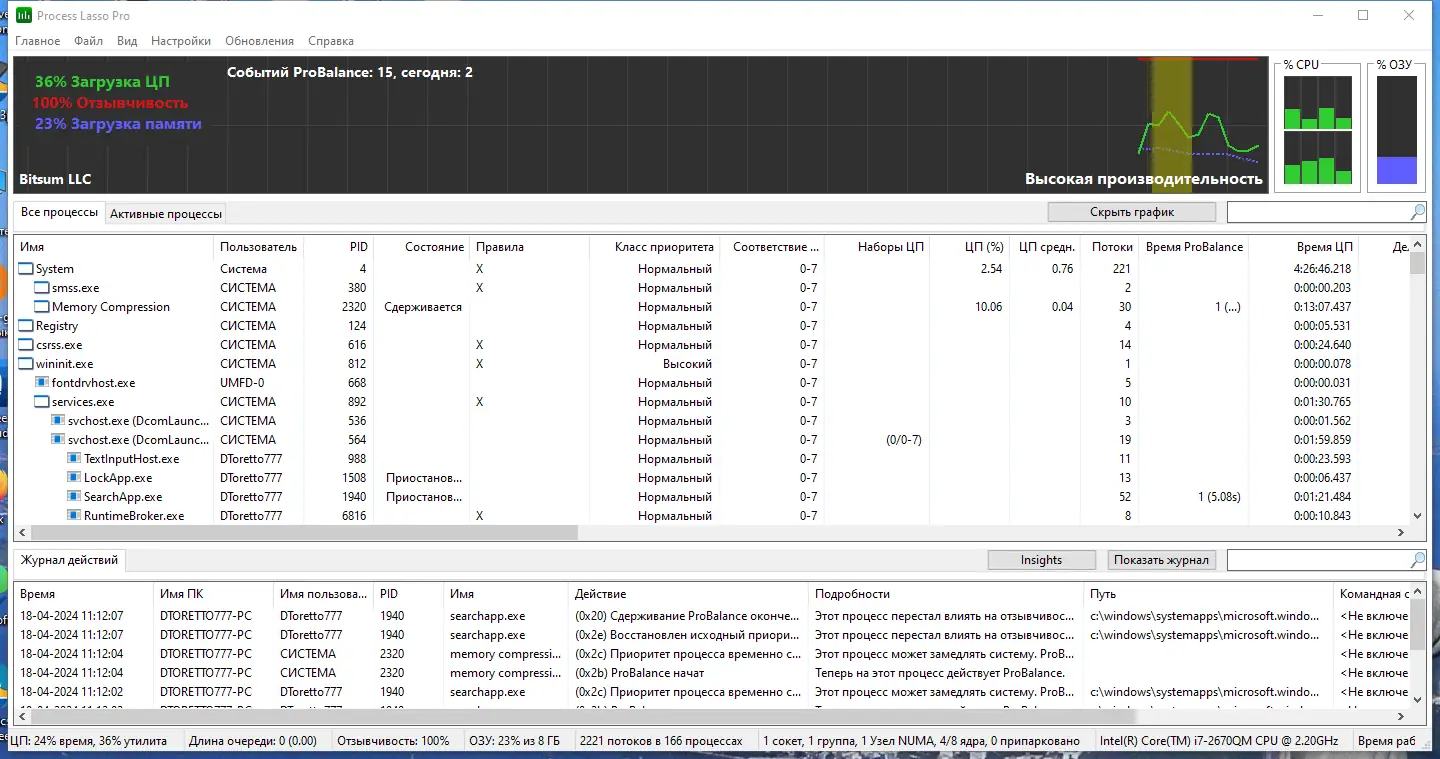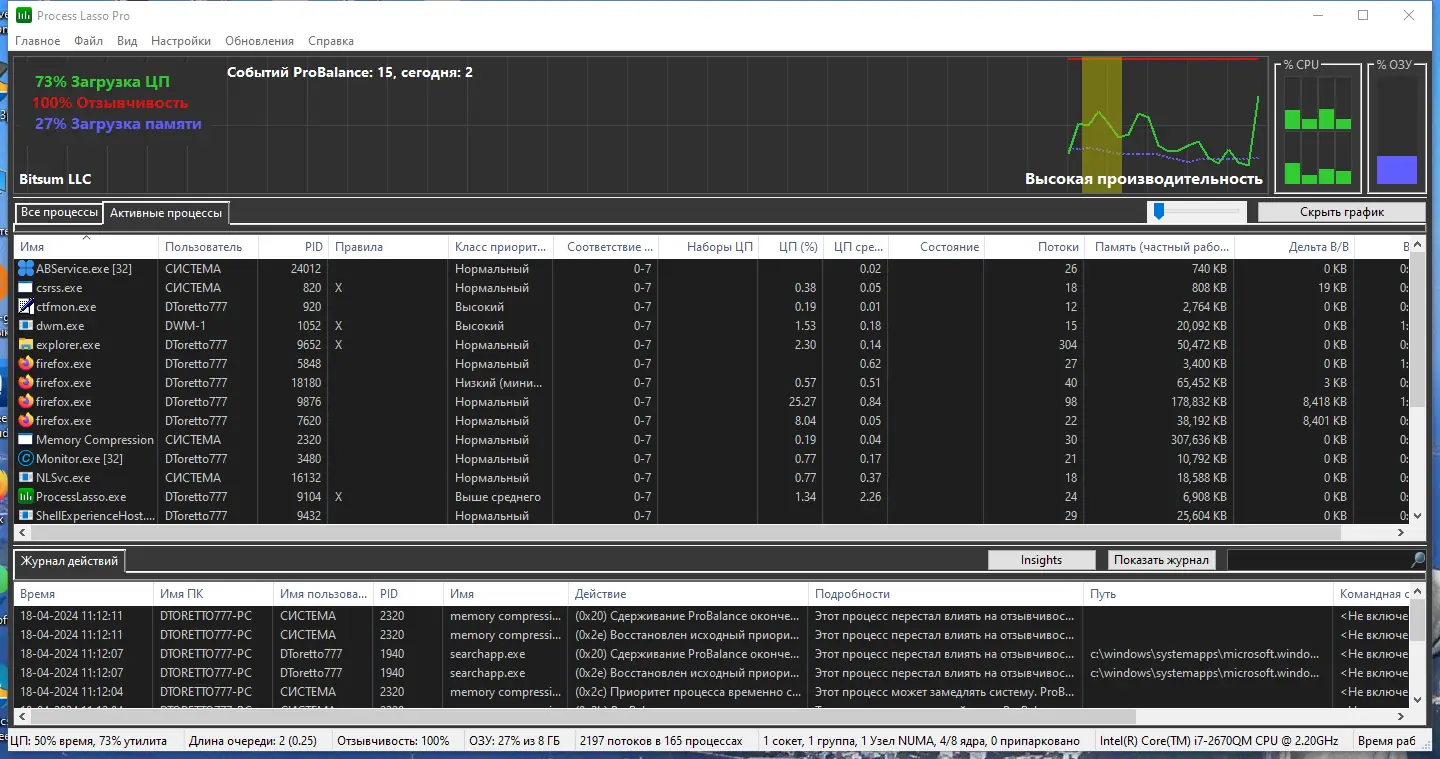 Process Lasso — это интеллектуальная утилита для управления процессами в операционной системе Windows, направленная на повышение отзывчивости и стабильности компьютера. Программа автоматически регулирует приоритеты запущенных приложений, предотвращая перегрузку центрального процессора и обеспечивая плавную работу системы даже при высокой нагрузке.