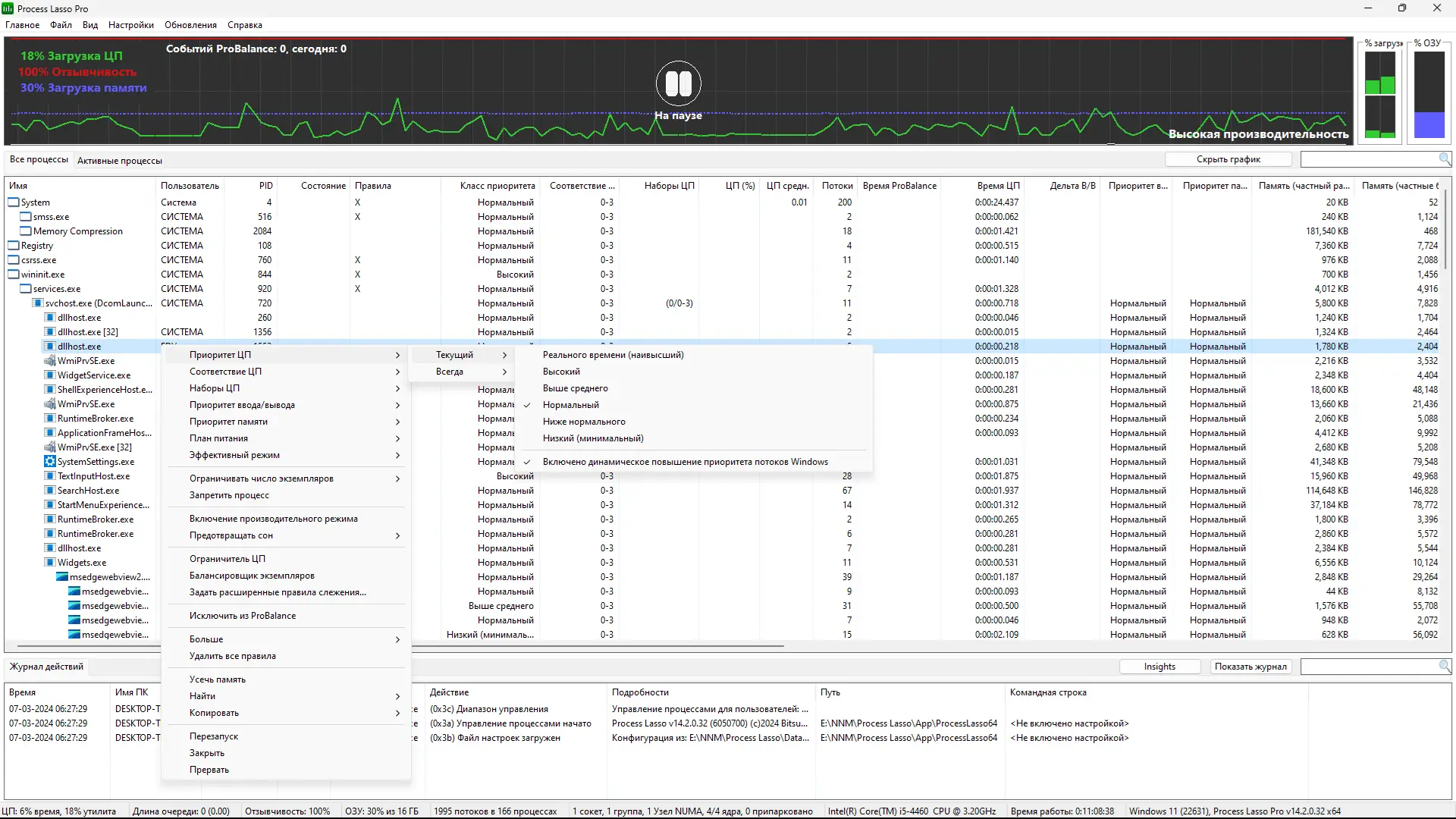 Использование Process Lasso не требует глубоких технических знаний. После запуска программа начинает мониторинг активности процессов в реальном времени. Через графический интерфейс можно вручную задавать приоритеты, устанавливать правила родства процессов к определённым ядрам процессора или блокировать запуск нежелательных приложений. Удобное контекстное меню, вызываемое правым кликом, позволяет быстро применять настройки к любому процессу. Также доступен динамический график загрузки системы, отражающий изменения в производительности и реактивности. Пользователь может настроить уведомления и всплывающие подсказки, чтобы отслеживать изменения в поведении процессов.