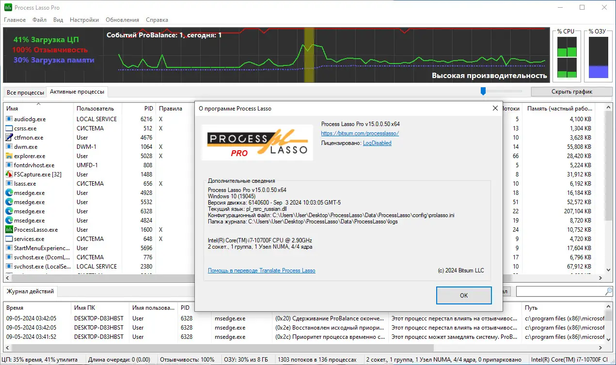 Process Lasso представляет собой продвинутый инструмент для управления процессами в среде Windows, позволяющий поддерживать высокую производительность системы за счёт динамической корректировки приоритетов выполнения задач. В отличие от стандартного диспетчера задач, приложение действует в фоновом режиме, предотвращая зависания и лаги, вызванные процессами с высоким потреблением ресурсов. Оно работает как с системными, так и с пользовательскими приложениями, адаптируя их поведение под текущую нагрузку.