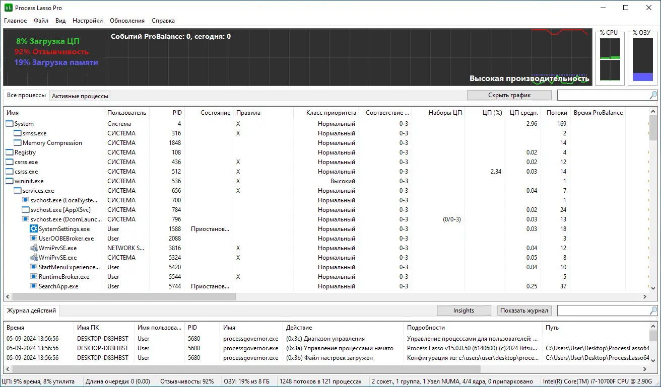 Process Lasso сочетает в себе широкие функциональные возможности и высокую стабильность, что делает её ценным инструментом для пользователей, стремящихся к оптимальной производительности. Программа эффективно справляется с задачей предотвращения зависаний и улучшения общего отклика системы, особенно на слабых или устаревших конфигурациях.