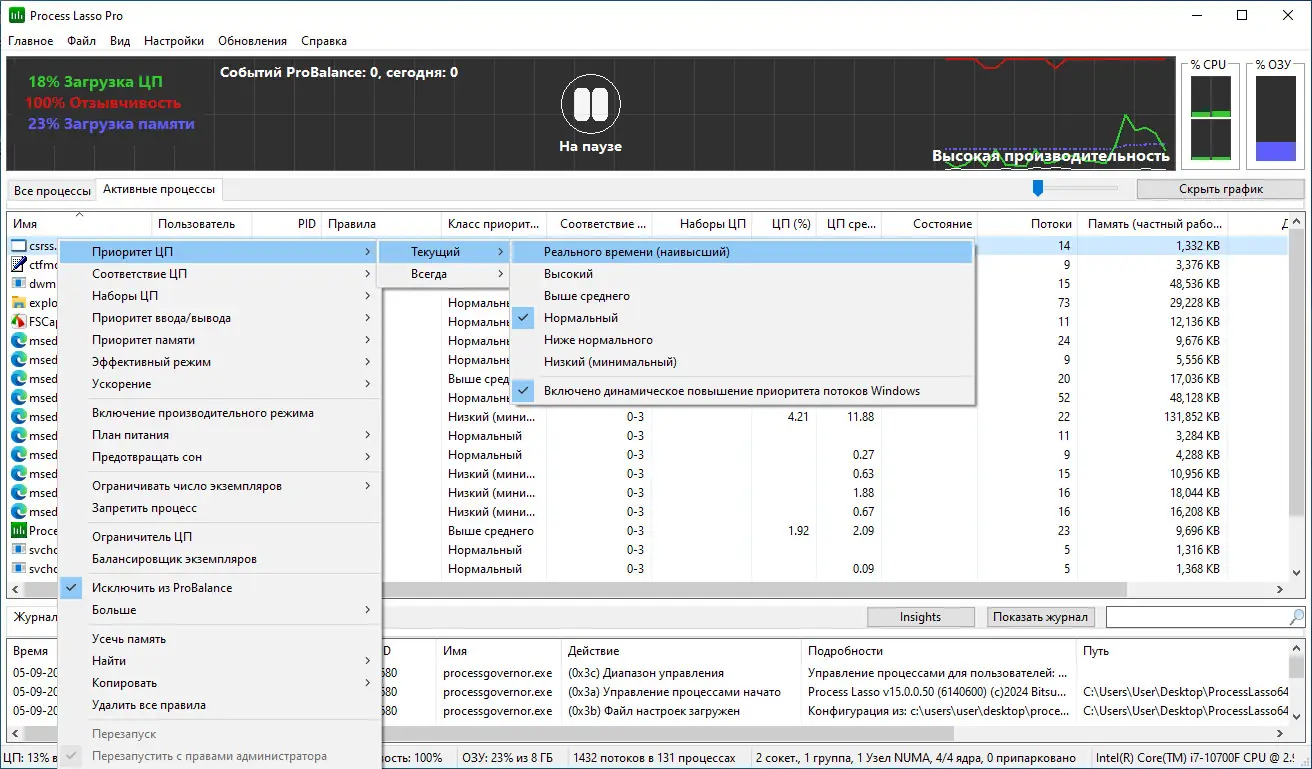 Использование Process Lasso не требует глубоких технических знаний. После запуска программа начинает фоновую работу, отслеживая активность процессов и при необходимости корректируя их приоритет. Пользователь может настроить правила через интуитивно понятный графический интерфейс: например, установить высокий приоритет для игровых приложений или понизить нагрузку от фоновых служб. Контекстное меню, вызываемое правой кнопкой мыши, позволяет быстро изменить параметры процесса, включая его привязку к определённым ядрам процессора. Также доступна настройка триггеров, реагирующих на изменение нагрузки или запуск конкретной программы. Даже при закрытом интерфейсе утилита продолжает функционировать, обеспечивая непрерывный контроль над системой.