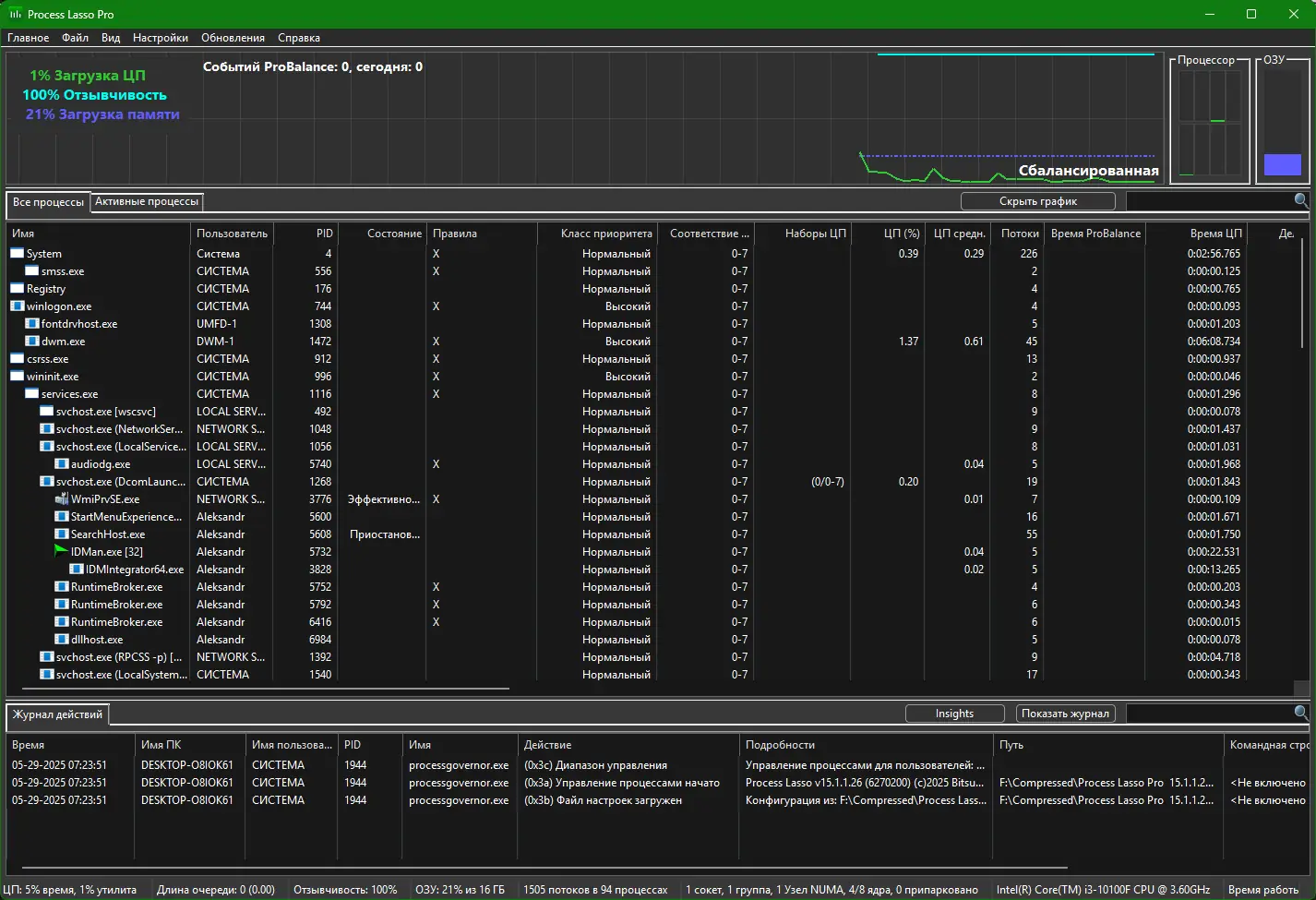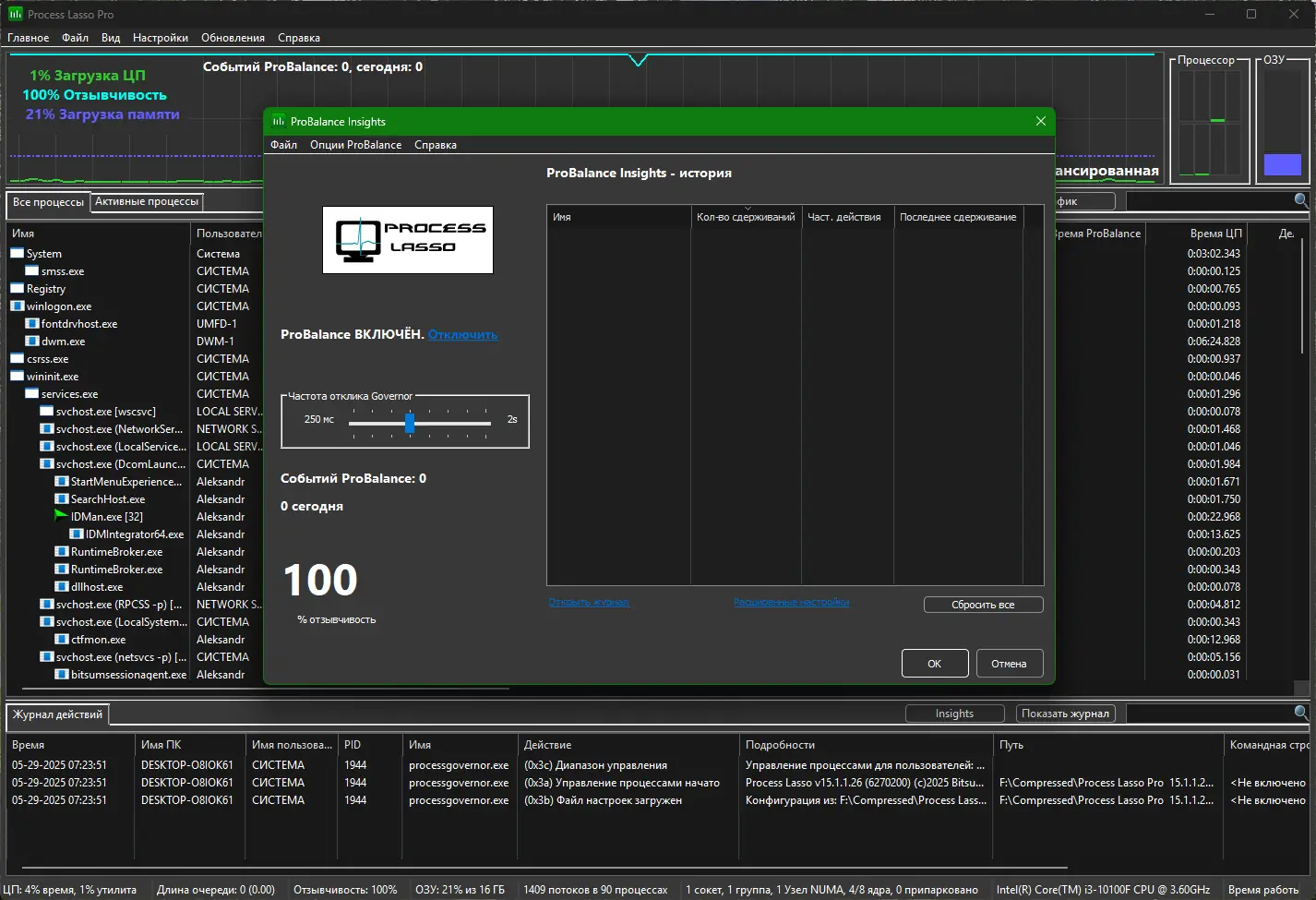 Технология ProBalance обеспечивает плавную работу интерфейса, даже если какой-либо процесс нагружает процессор на 100%.