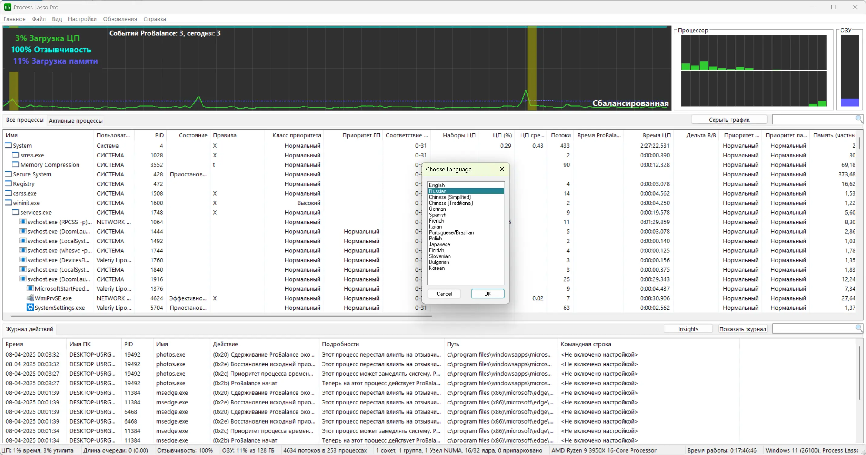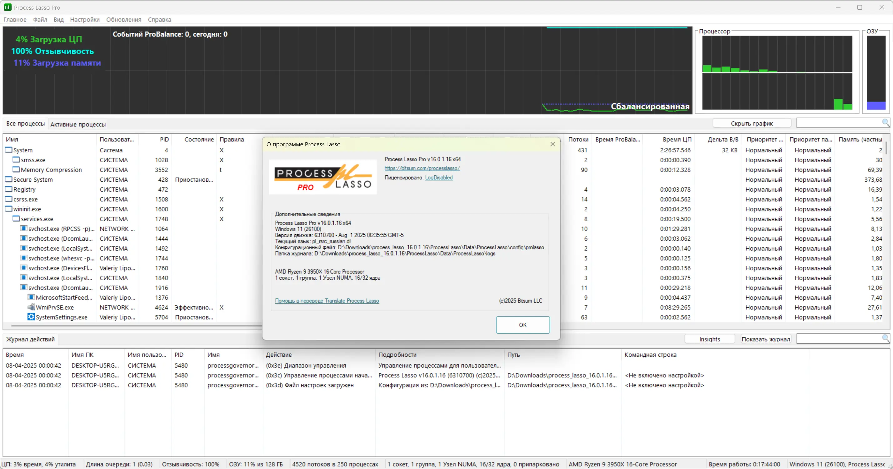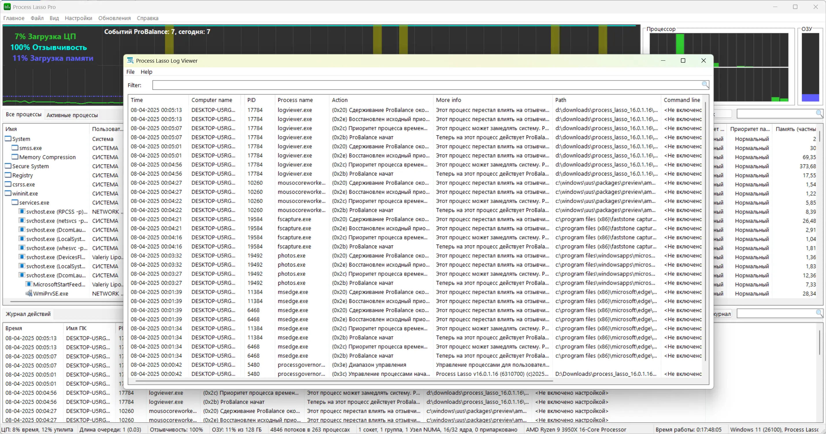 Интерфейс Process Lasso интуитивно понятен и не требует глубоких знаний в области системного администрирования. Достаточно запустить программу, и она начнёт автоматически анализировать запущенные процессы, применяя оптимизацию на основе встроенных правил. Пользователь может вручную задавать приоритеты приложениям, устанавливать ограничения на количество экземпляров или запрещать запуск определённых программ через контекстное меню. Графики загрузки ЦП и реактивности системы позволяют наглядно оценить эффективность настройки и вносить корректировки при необходимости.