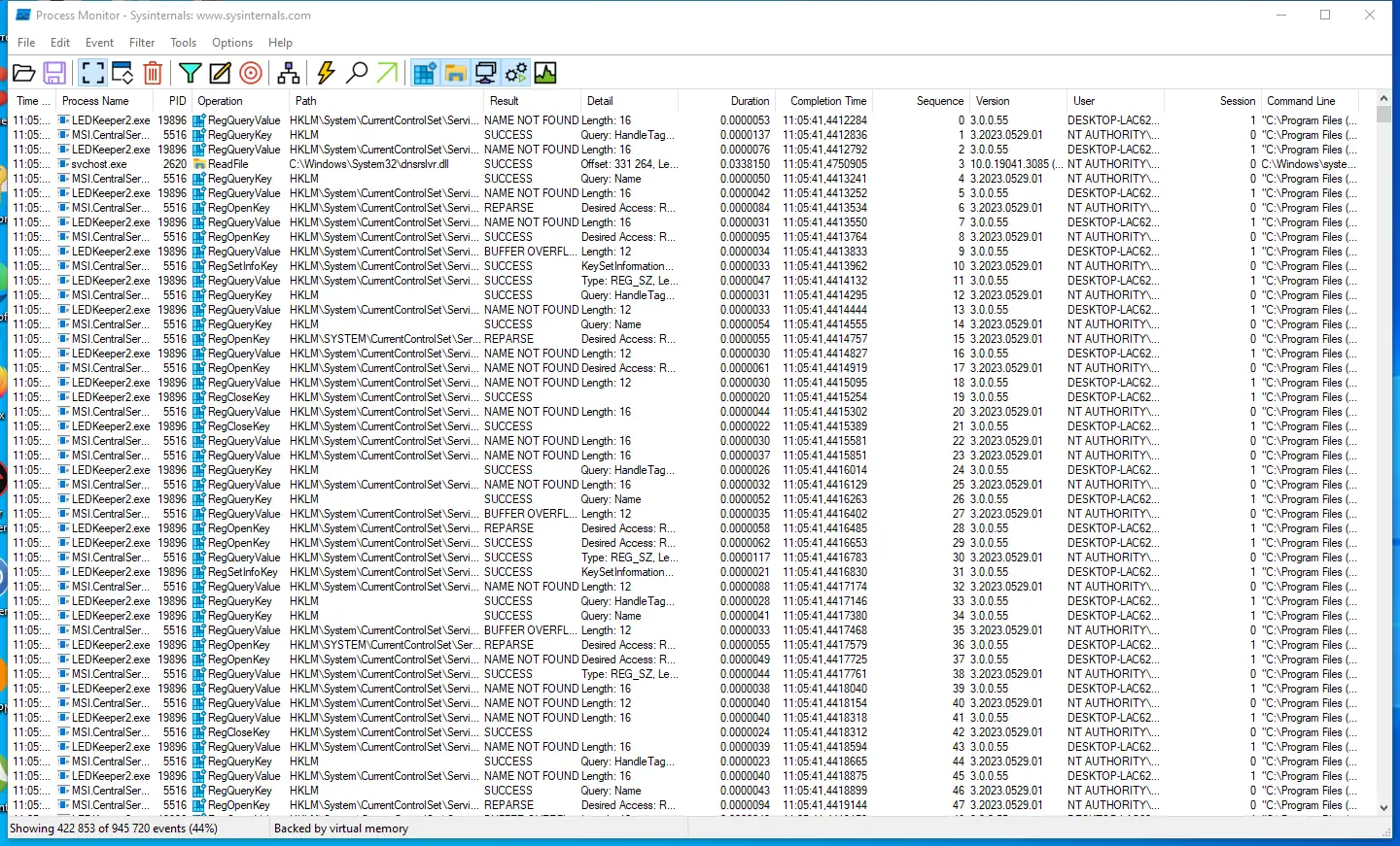 Process Monitor сохраняет полную достоверность данных о процессах, включая путь к исполняемому файлу, командную строку запуска, а также идентификаторы пользователей и сессий.