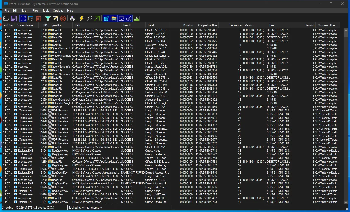 Использование Process Monitor не требует установки — достаточно запустить исполняемый файл procmon. После запуска начинается автоматическая регистрация событий, которые отображаются в виде таблицы с детализированными колонками. Пользователь может настроить отображение полей, перемещая и скрывая колонки по своему усмотрению. Для анализа можно применять фильтры по любому из полей, включая скрытые, что позволяет быстро находить нужные события среди миллионов записей. Поддерживается поиск с остановкой процесса просмотра при нахождении совпадения, что удобно при отладке. Также доступна возможность записи событий в файл журнала, включая данные, сгенерированные в процессе загрузки системы, что особенно полезно при анализе проблем на старте windows.