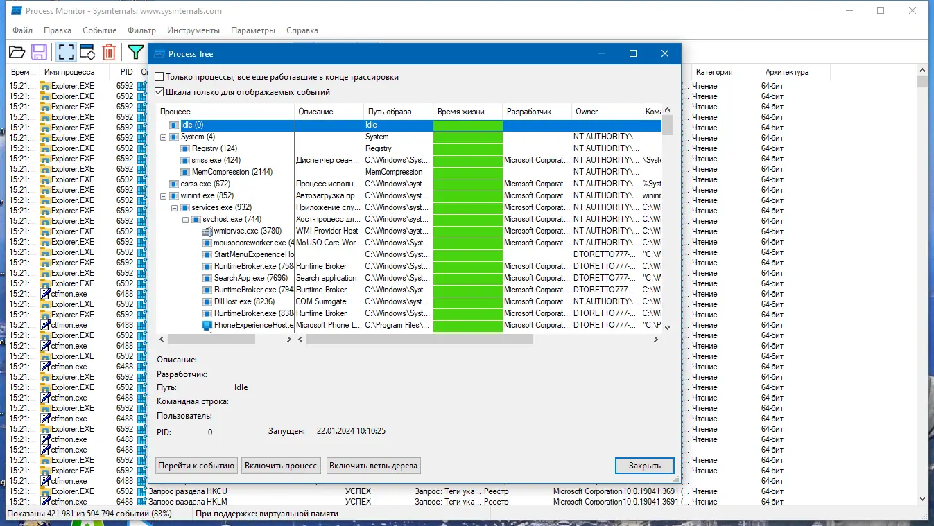 Запуск Process Monitor не требует установки — это портативная утилита, которую можно сразу использовать после распаковки. Интерфейс программы представлен в виде таблицы с событиями, где каждая строка соответствует определённому действию: чтению файла, записи в реестр, созданию потока и т.д. Пользователь может настроить фильтры по любому полю, включая имя процесса, путь, тип операции или имя пользователя. Это позволяет сузить поток данных до релевантных событий. Также доступна функция поиска, которая работает в уже собранной трассировке, и возможность сохранять журналы для последующего анализа. Ведение логов при загрузке системы позволяет отслеживать процессы, запускающиеся до входа пользователя, что особенно ценно при диагностике проблем на этапе ing system.