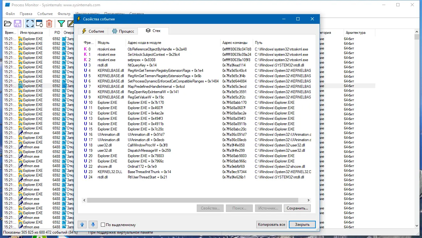 - Высокая детализация событий с возможностью просмотра стека вызовов и атрибутов процесса.