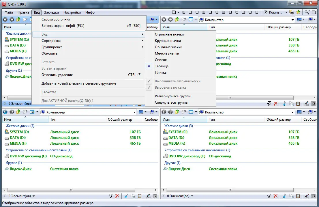 Q-Dir — это компактный файловый менеджер с четырьмя панелями, позволяющий эффективно управлять файлами и папками. Программа отличается низкими требованиями к системе и поддерживает работу с архивами, FTP-серверами, экспорт данных и быстрый доступ к часто используемым каталогам.