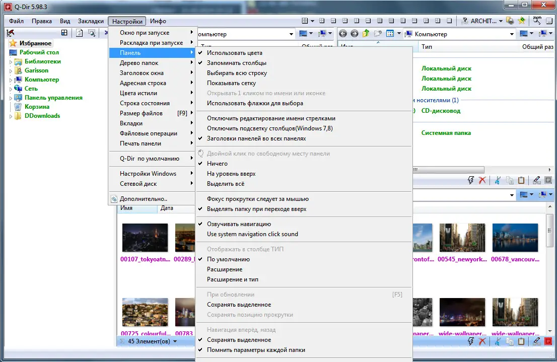 Использование Q-Dir не требует глубоких знаний операционной системы. После запуска программа отображает четыре панели, каждая из которых может быть настроена на отображение любого каталога. Пользователь может быстро переключаться между режимами просмотра: список, таблица, иконки, эскизы. Для навигации доступны горячие клавиши, включая переход между вкладками, обновление содержимого и быстрое открытие свойств файлов. Встроенная лупа позволяет увеличивать содержимое экрана, а фильтр выделения помогает находить нужные элементы по заданным критериям. Просмотр изображений осуществляется в режиме предварительного просмотра с генерацией миниатюр, что особенно удобно при работе с большими коллекциями.