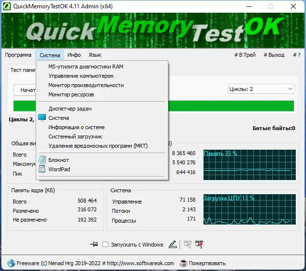 QuickMemoryTestOK — это компактная утилита для диагностики оперативной памяти компьютера, позволяющая выявить потенциально нестабильные или дефектные участки RAM. Программа помогает убедиться в исправности всей доступной памяти, особенно актуально при использовании систем с большим объёмом ОЗУ, где часть модулей может не задействоваться в повседневной работе.