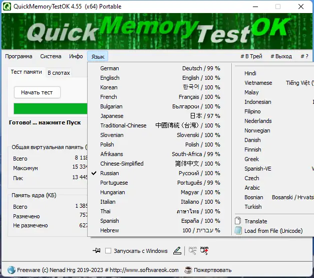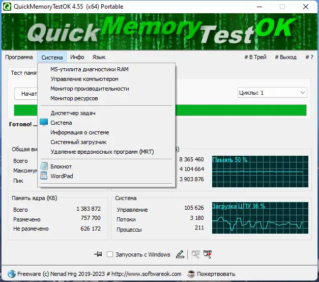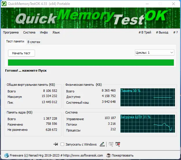 QuickMemoryTestOK — это специализированная системная утилита, предназначенная для диагностики оперативной памяти. Она позволяет протестировать всю доступную физическую память на наличие ошибок чтения и записи. Утилита не требует сложной настройки и подходит как для опытных пользователей, так и для новичков. Благодаря минимальному потреблению ресурсов, тестирование можно проводить даже на слабых системах. Программа не перегружает процессор и не вмешивается в работу других компонентов.