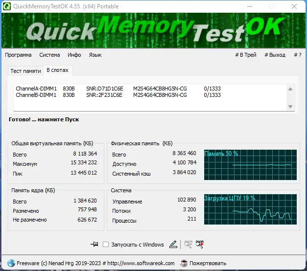 QuickMemoryTestOK — это компактная утилита для проверки оперативной памяти на наличие ошибок. Программа помогает выявить дефектные участки ОЗУ, особенно актуально при покупке нового или б/у компьютера. Проверка памяти позволяет избежать сбоев системы в будущем и убедиться в стабильности работы оборудования до окончания гарантийного срока.