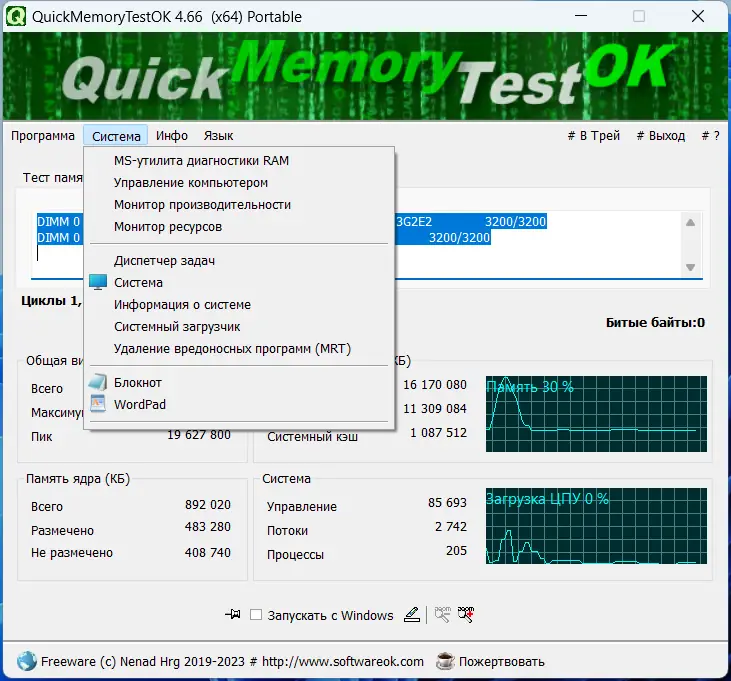 QuickMemoryTestOK — компактная утилита для диагностики оперативной памяти, позволяющая быстро выявить сбои и нестабильность в работе RAM. Программа подходит как для обычных пользователей, так и для специалистов, которым необходимо протестировать систему под высокой нагрузкой и определить причины возможных сбоев.