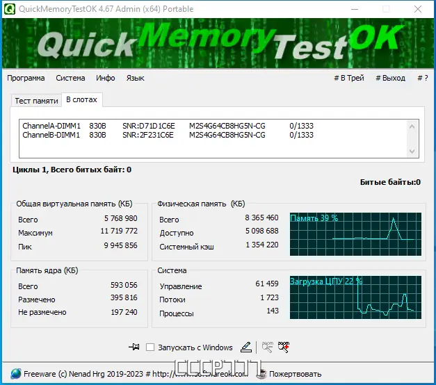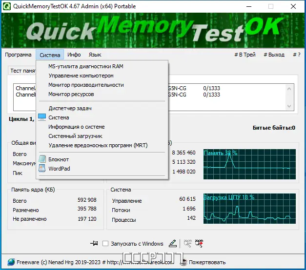 QuickMemoryTestOK — компактная утилита для диагностики оперативной памяти, позволяющая выявить сбои и нестабильность системы под нагрузкой. Программа помогает протестировать RAM на ошибки, отследить поведение ПК при высокой загрузке и определить, связаны ли сбои с работой памяти. Подходит как для обычных пользователей, так и для специалистов, проводящих техническую диагностику.