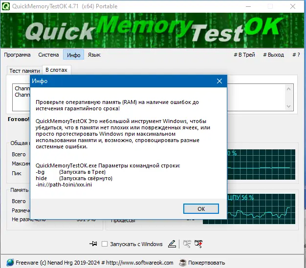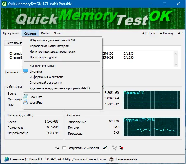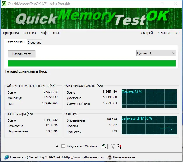 QuickMemoryTestOK — это компактная утилита для диагностики оперативной памяти, способная выявить сбои и нестабильность в работе RAM. Программа позволяет проводить быстрые и настраиваемые тесты, а также отслеживать поведение системы под нагрузкой, что помогает определить причины возможных сбоев.