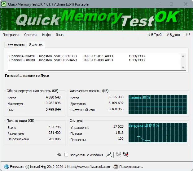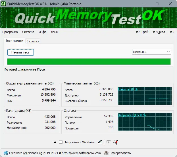 QuickMemoryTestOK — это компактная утилита для диагностики оперативной памяти, позволяющая быстро выявить сбои и нестабильность в работе RAM. Программа помогает определить, является ли память источником системных ошибок, зависаний или синих экранов, а также отслеживает поведение системы под высокой нагрузкой.