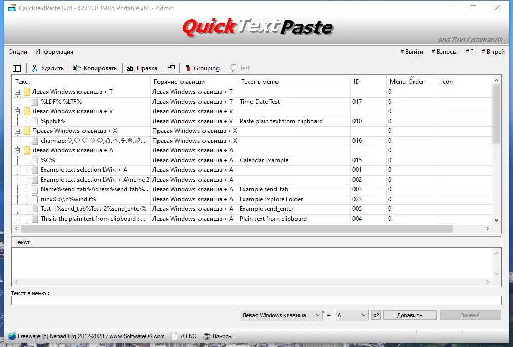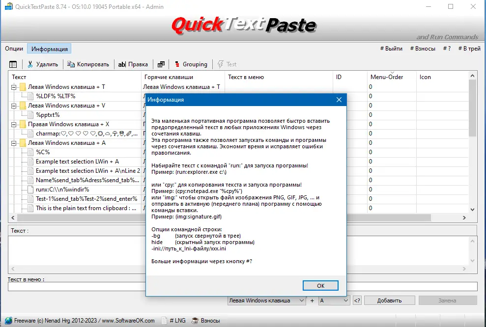 QuickTextPaste — это компактная системная утилита для Windows, позволяющая быстро вставлять часто используемые фрагменты текста с помощью горячих клавиш. Программа идеально подходит для тех, кто регулярно работает с повторяющимися текстовыми данными, формами или шаблонами, и стремится оптимизировать своё время.