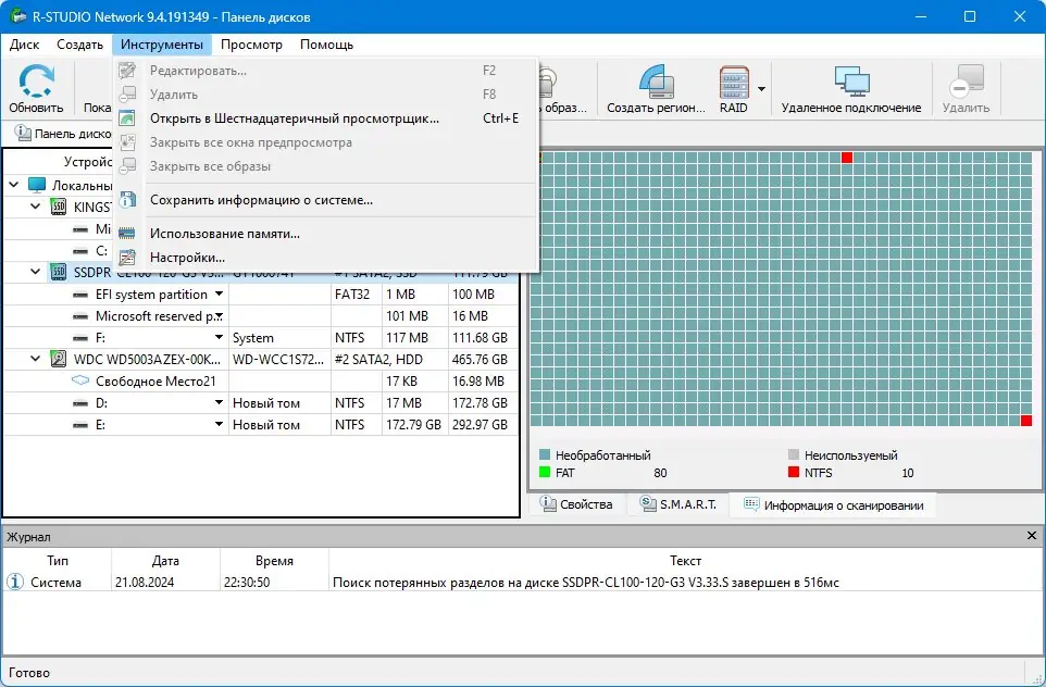 R-Studio — это профессиональная система резервирования и восстановления данных, разработанная для работы в сложных условиях потери информации. Программа использует передовые алгоритмы анализа дискового пространства, что позволяет находить и восстанавливать файлы даже при серьёзных повреждениях файловой структуры. Она поддерживает как стандартные сценарии восстановления, так и сложные случаи, такие как разрушенные RAID-массивы или зашифрованные тома.