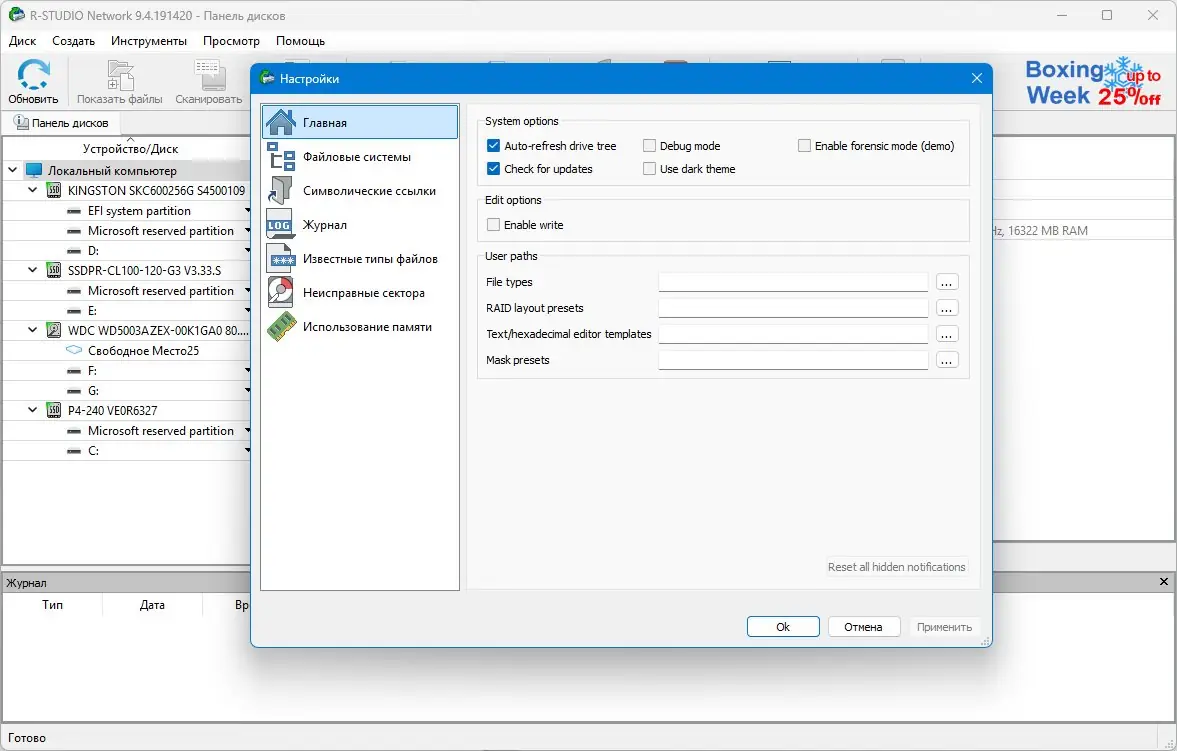 Интерфейс R-Studio построен по принципу стандартного проводника Windows, что упрощает навигацию и работу с дисками и папками. После запуска утилита сканирует подключённые носители, анализирует их структуру и выявляет удалённые или повреждённые разделы. Пользователь может выбрать режим быстрого или глубокого сканирования в зависимости от ситуации и степени повреждения данных.