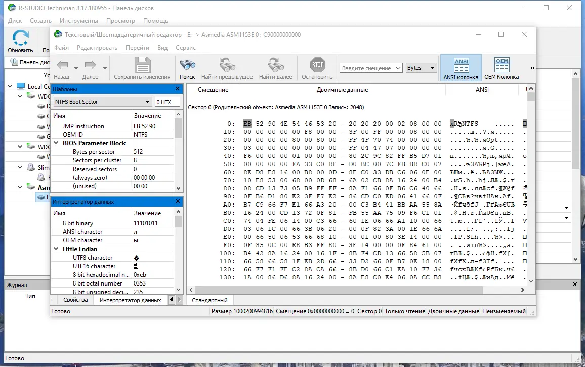 - Встроенный шестнадцатеричный редактор позволяет просматривать и изменять содержимое файлов и разделов на низком уровне.