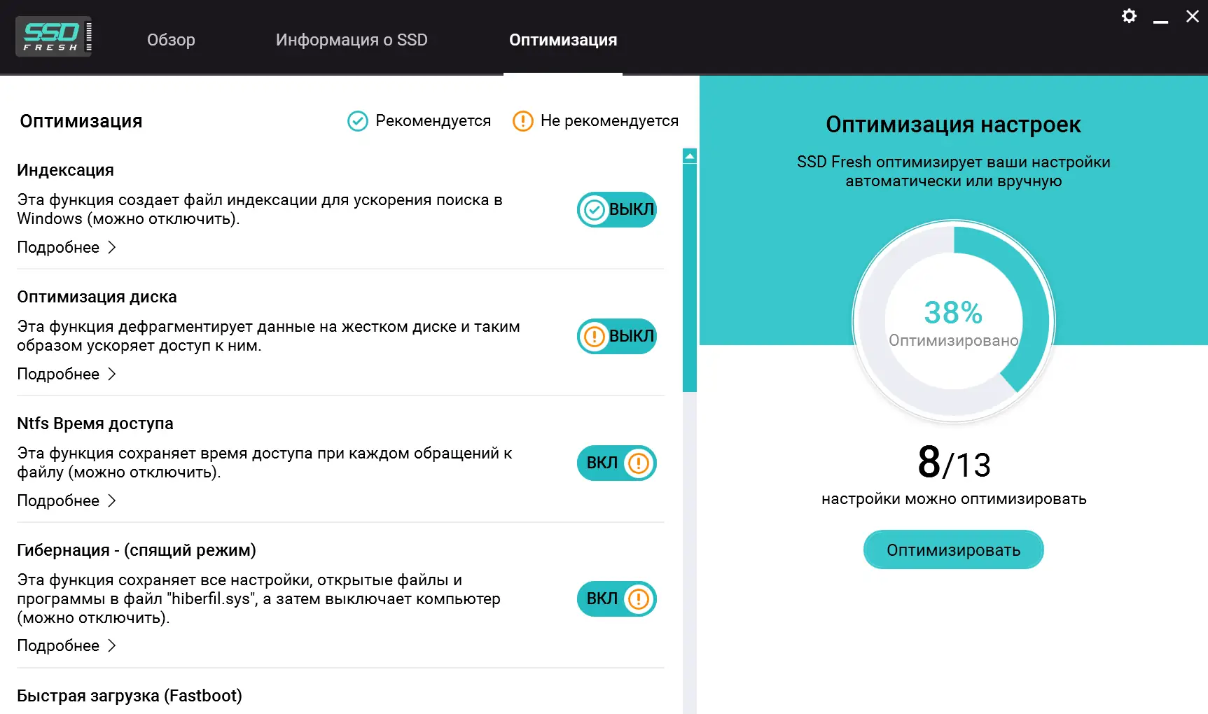 - Автоматическое отключение дефрагментации загрузочных файлов и других фоновых процессов, вредных для SSD.