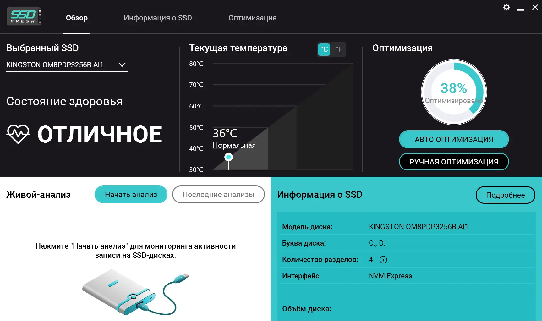 - Позволяет просматривать свойства подключённого SSD, включая объём, модель и серийный номер.