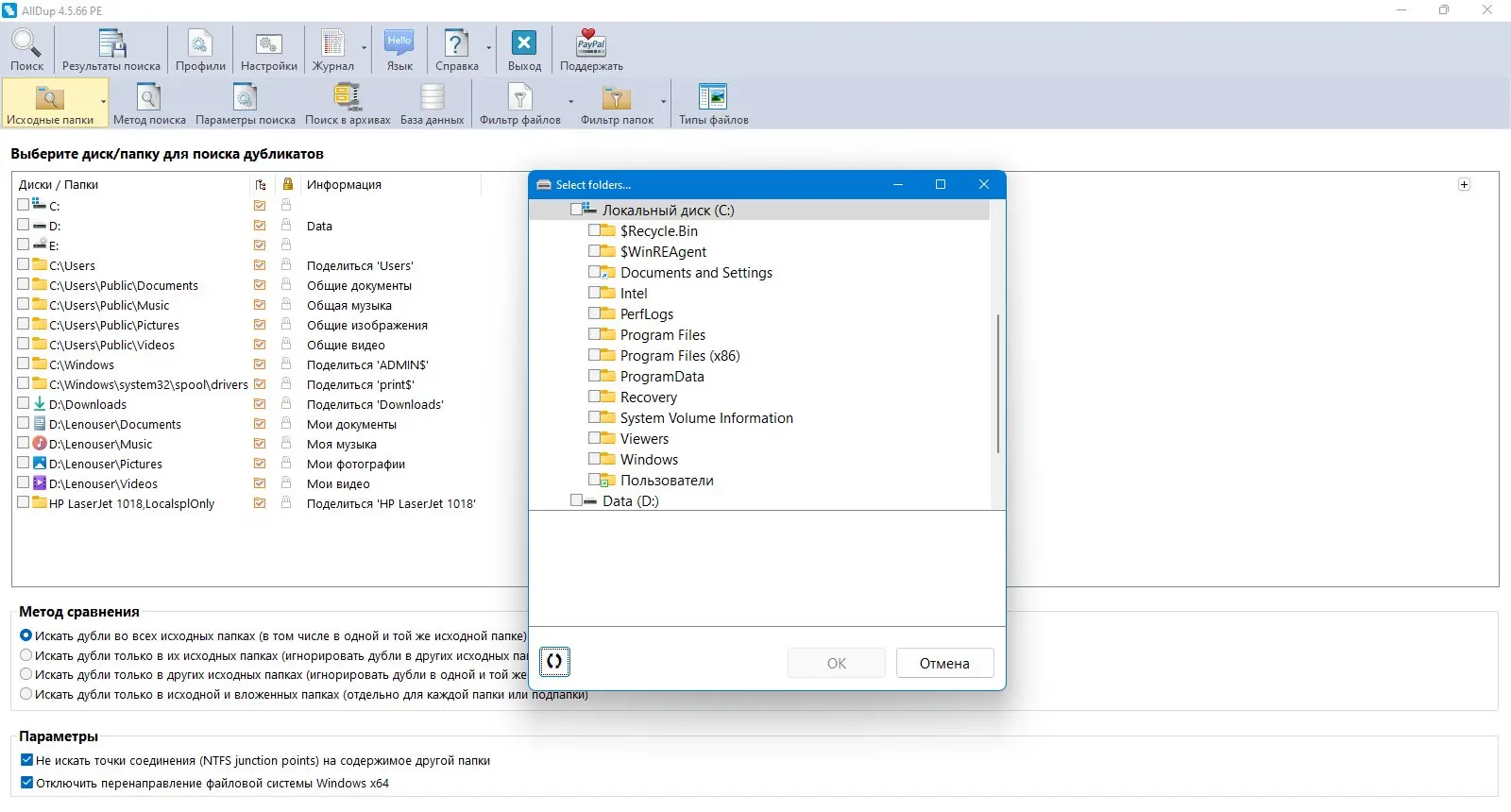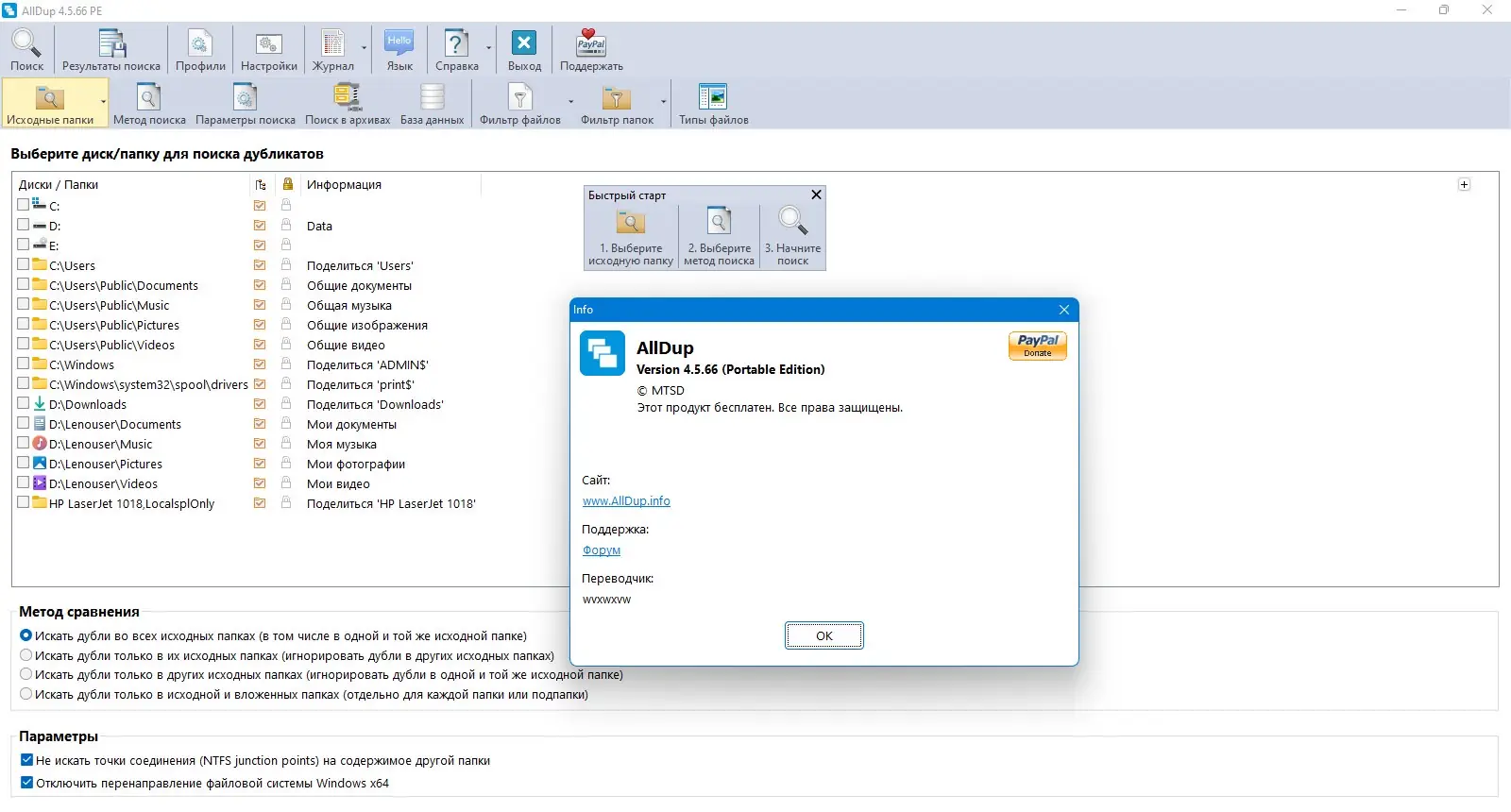 AllDup представляет собой специализированное приложение для оптимизации дискового пространства путём выявления и последующего удаления повторяющихся файлов. Инструмент поддерживает анализ по содержимому, имени, расширению, размеру и другим атрибутам, что обеспечивает высокую точность поиска. Он работает с любыми типами файлов, включая исполняемые, архивы, медиа и документы. Алгоритмы обработки оптимизированы для быстрого сканирования даже больших объёмов данных. Пользователь может настроить глубину поиска и исключить определённые папки или форматы.