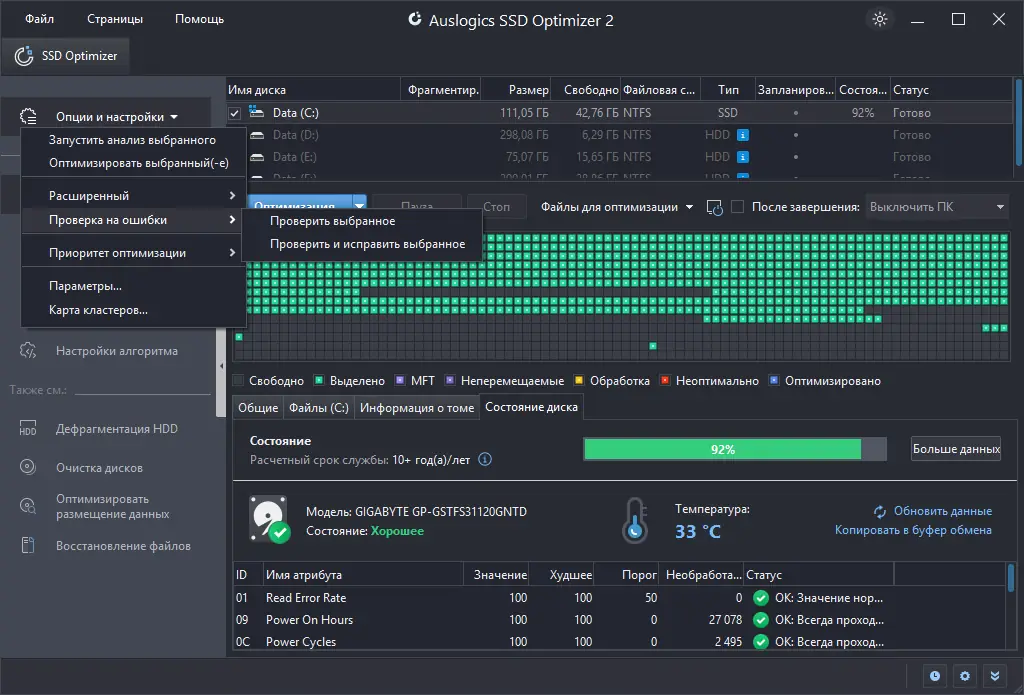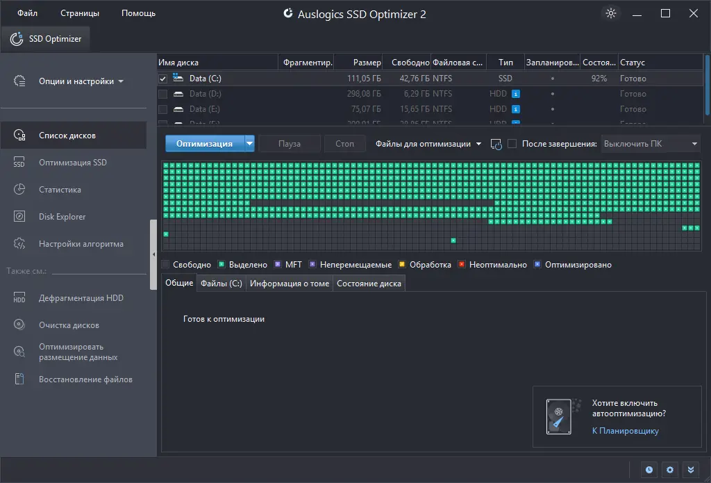 Auslogics SSD Optimizer — это утилита, разработанная для комплексной оптимизации твердотельных накопителей, позволяющая значительно повысить их производительность и продлить срок службы. Программа автоматизирует процесс обслуживания SSD, включая дефрагментацию, очистку от временных файлов и настройку системных параметров. Она подходит как для новичков, так и для опытных пользователей, стремящихся поддерживать диск в идеальном состоянии.