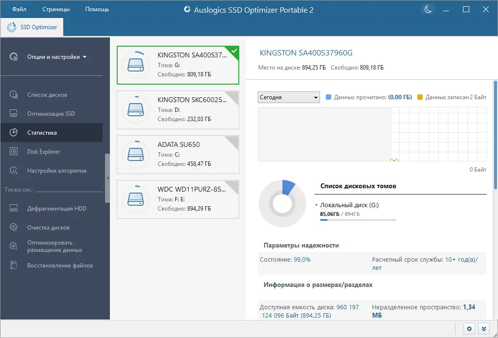 - Проверка состояния SSD, включая анализ объёма записанных и прочитанных данных.