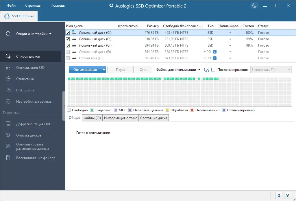 - Поддержка планирования оптимизации по расписанию для автоматического обслуживания диска.