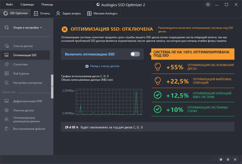 Программа сочетает в себе простоту использования и глубокую оптимизацию параметров системы, ориентированных на SSD.