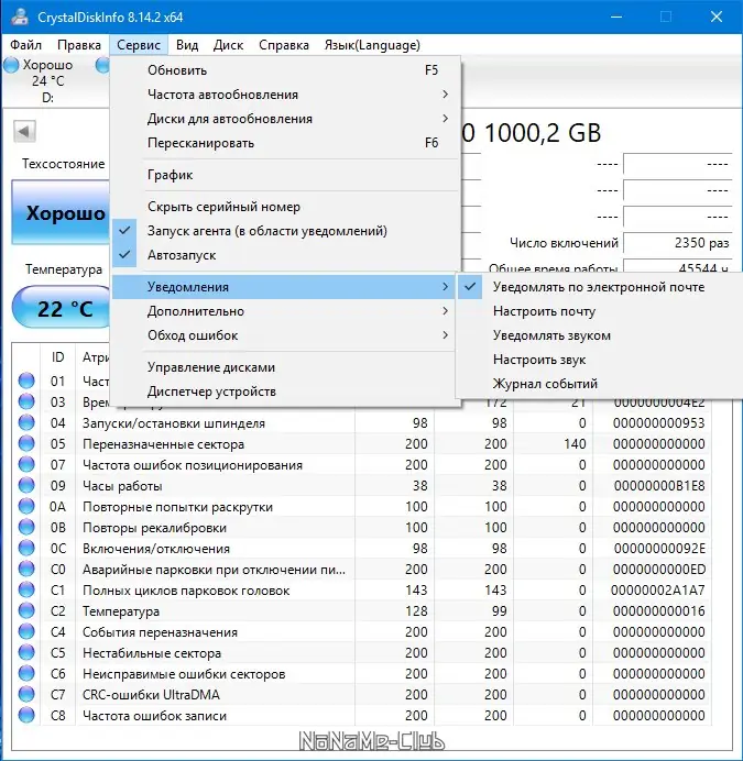 - Уведомления о превышении температурного порога или снижении здоровья диска