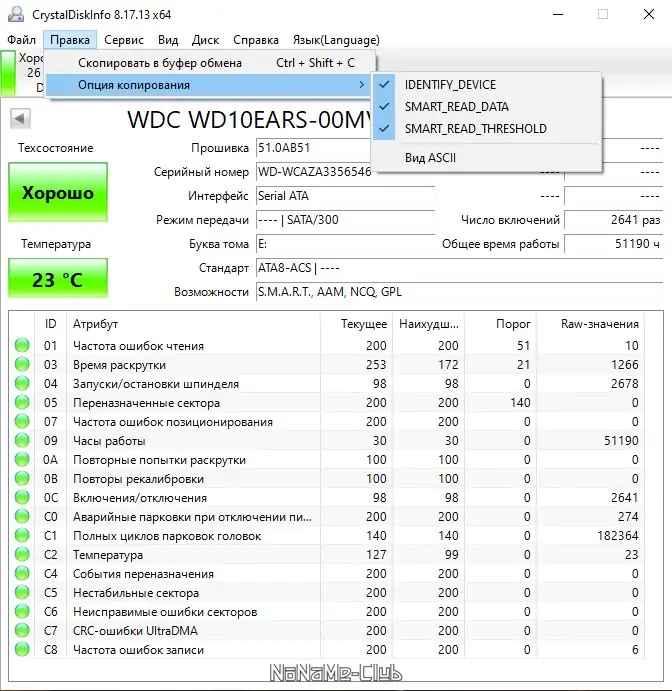 - Отображение технических характеристик: интерфейс подключения, объём, модель, серийный номер, прошивка
