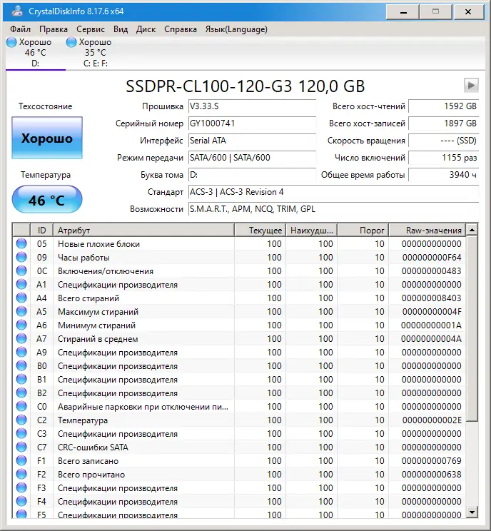 CrystalDiskInfo предоставляет детальную информацию о каждом накопителе, установленном в системе, включая модель, серийный номер, интерфейс подключения и версию прошивки. Утилита анализирует атрибуты S.M.A.R.T., такие как количество плохих секторов, ошибки чтения и записи, износ ssd, а также статистику по запускам шпинделя. Интерфейс отображает общую оценку состояния диска, выделяя потенциально проблемные накопители цветовой индикацией.