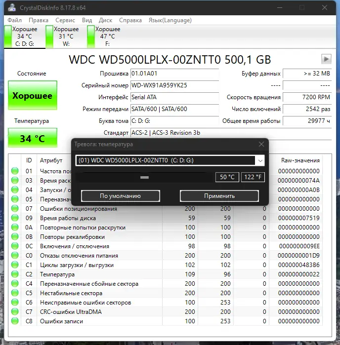После запуска утилита автоматически определяет все накопители в системе и отображает их основные характеристики: модель, объём, интерфейс подключения, версию прошивки и серийный номер. Пользователь может переключаться между дисками, просматривать детальные атрибуты S.M.A.R.T., а также настраивать пороги предупреждений. Для SSD доступна оценка оставшегося ресурса, основанная на счётчиках износа ячеек памяти и количестве перезаписей.